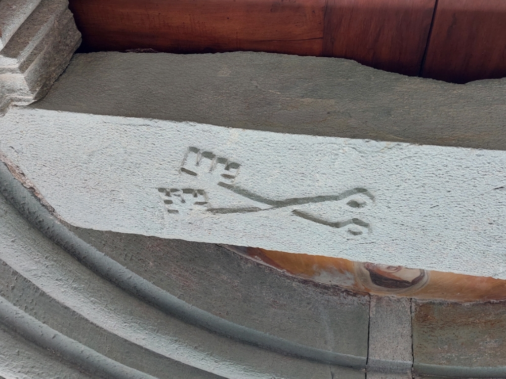 Stroppo - Chiesa di San Pietro o San Peyre - Fondo nicchia campanile, san Pietro, didascalia - Mario Falchi - 2025