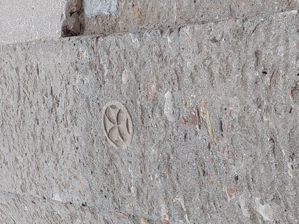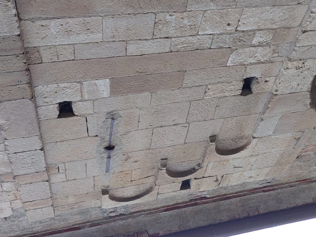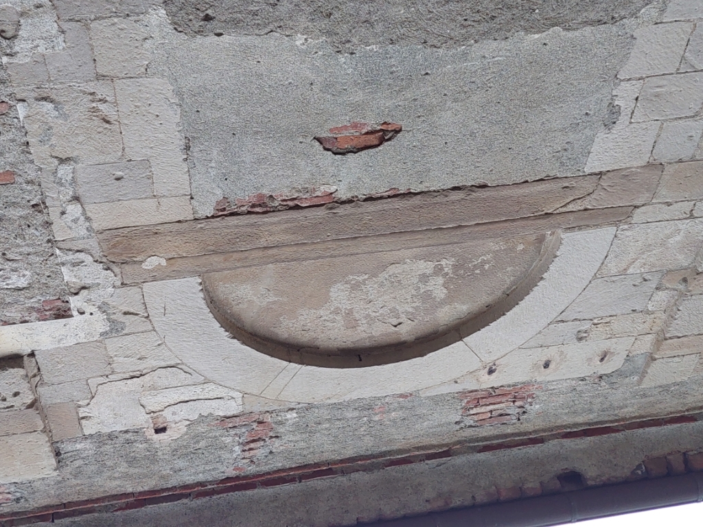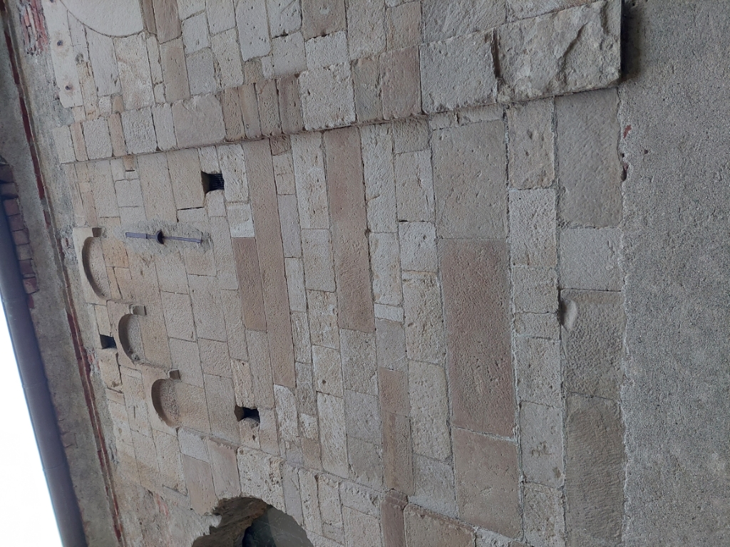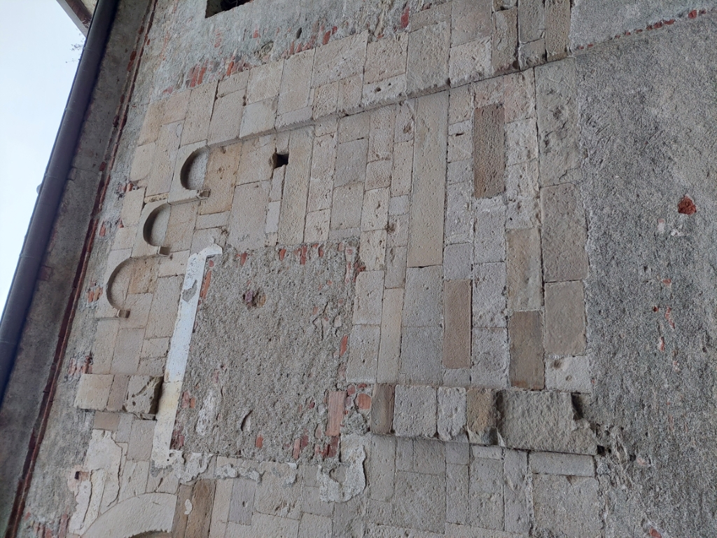 Esterno: antica facciata nel muro perimetrale destro con archi di pietra grigia. |