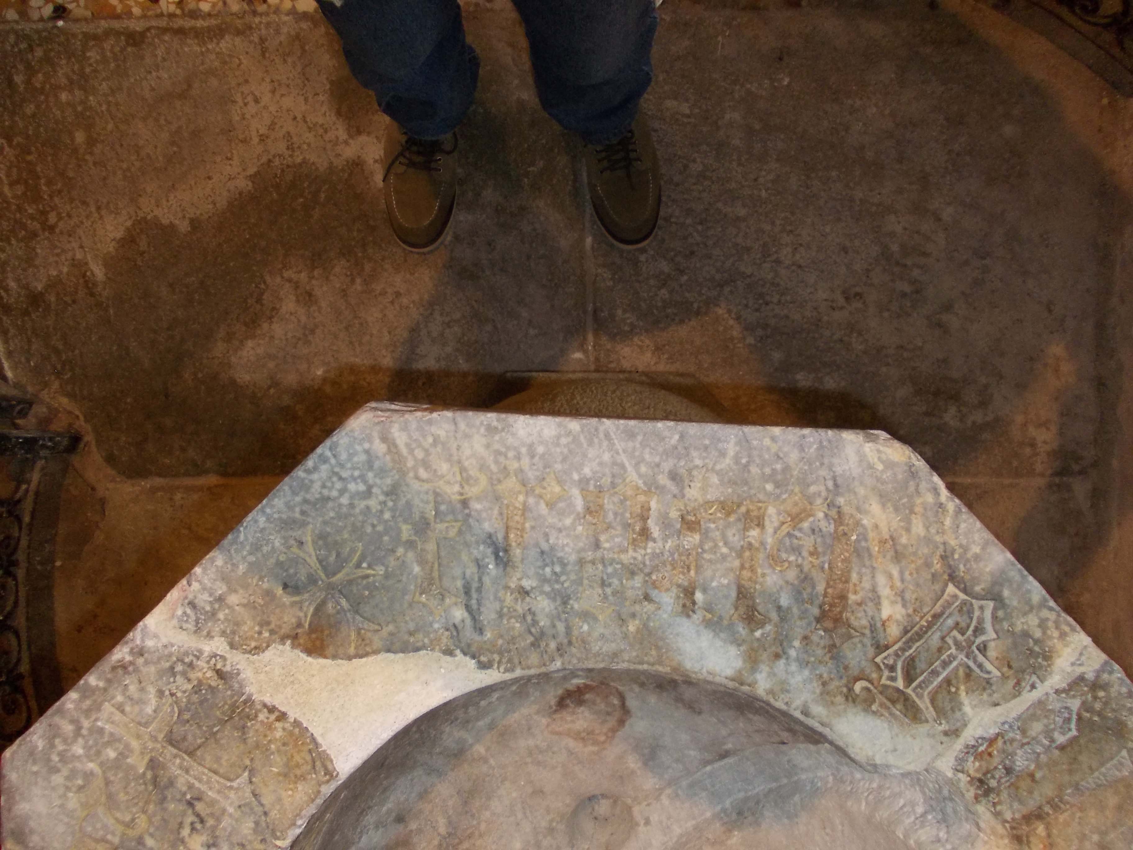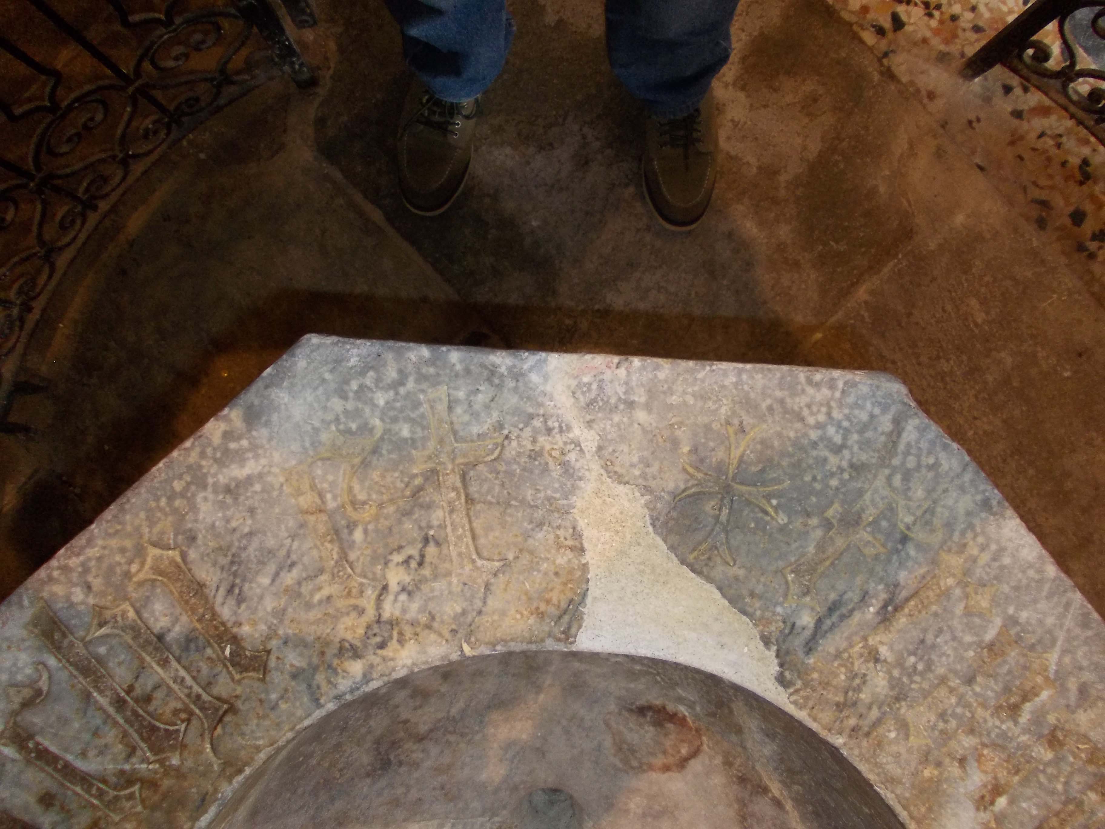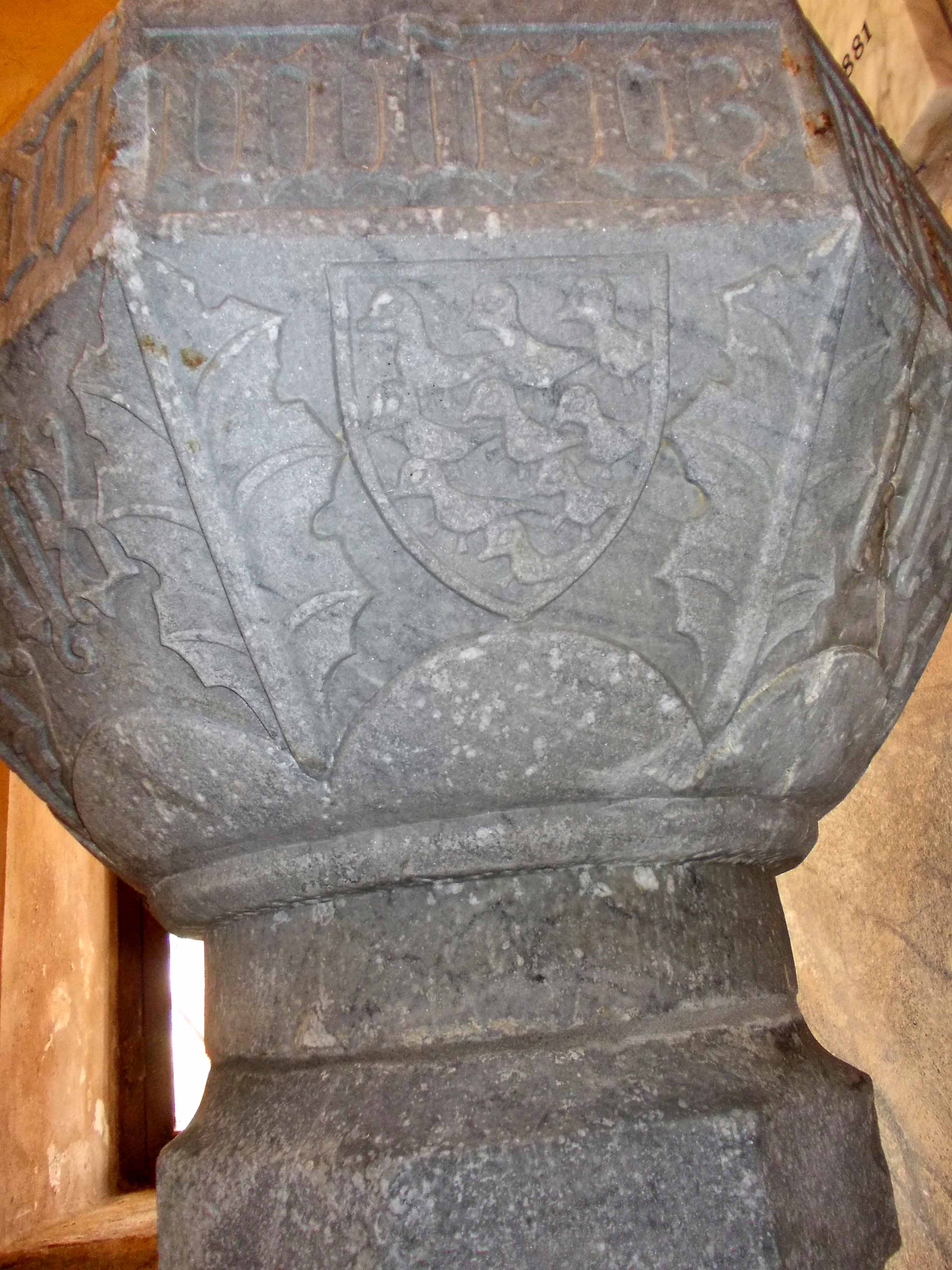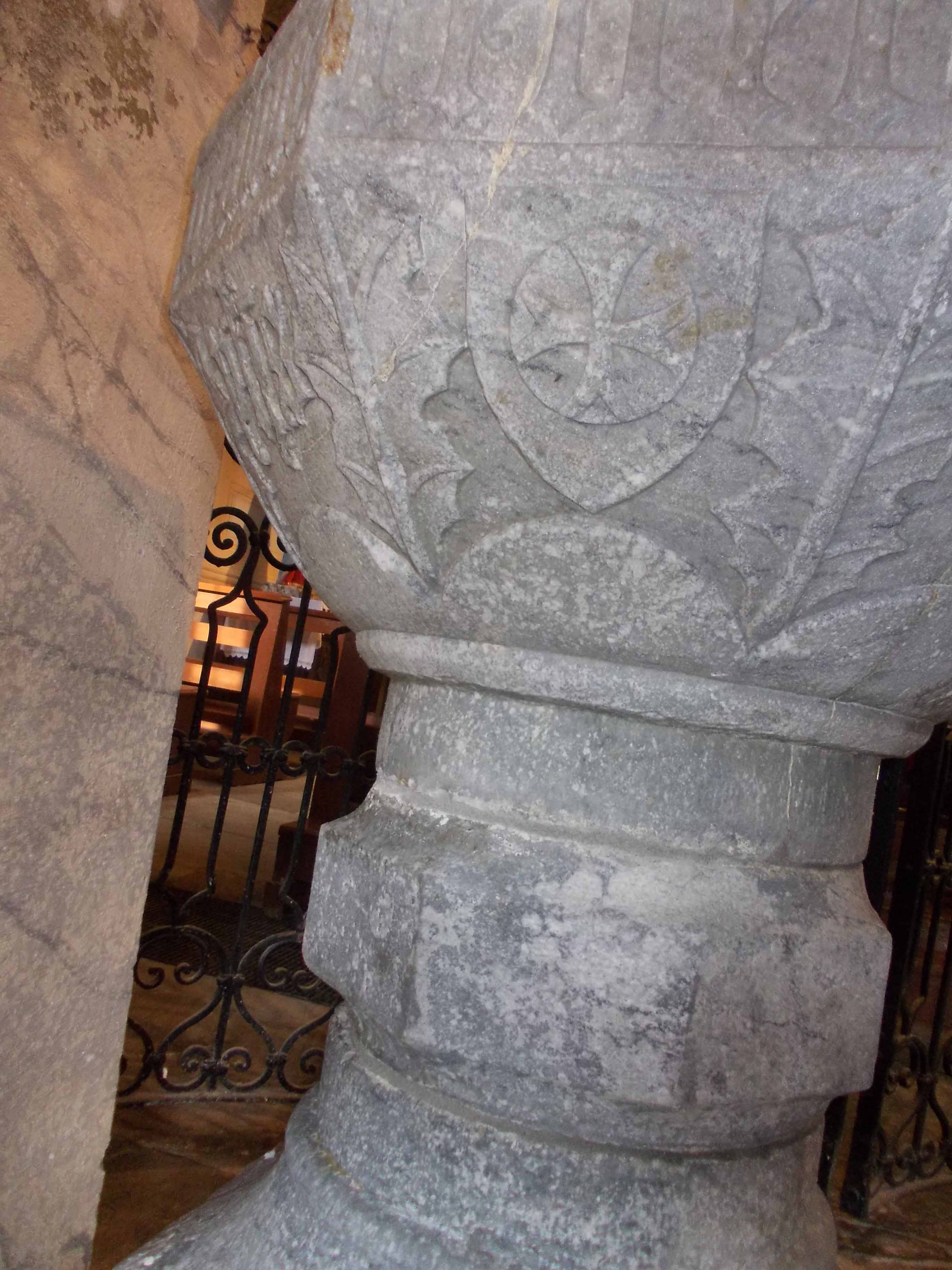 fonte battesimale del '400 della scuola degli Zabreri con stemma dei Marchesi di Saluzzo e dei Piossasco. |