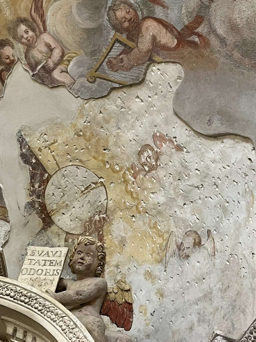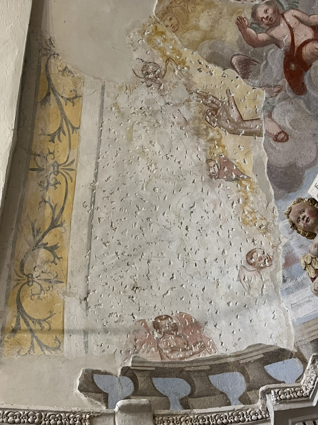 Interno: Cristo Pantocratore che sì intravede ancor oggi nella volta della cappella maggiore è testimonianza di una decorazione quattro-cinquecentesca. |