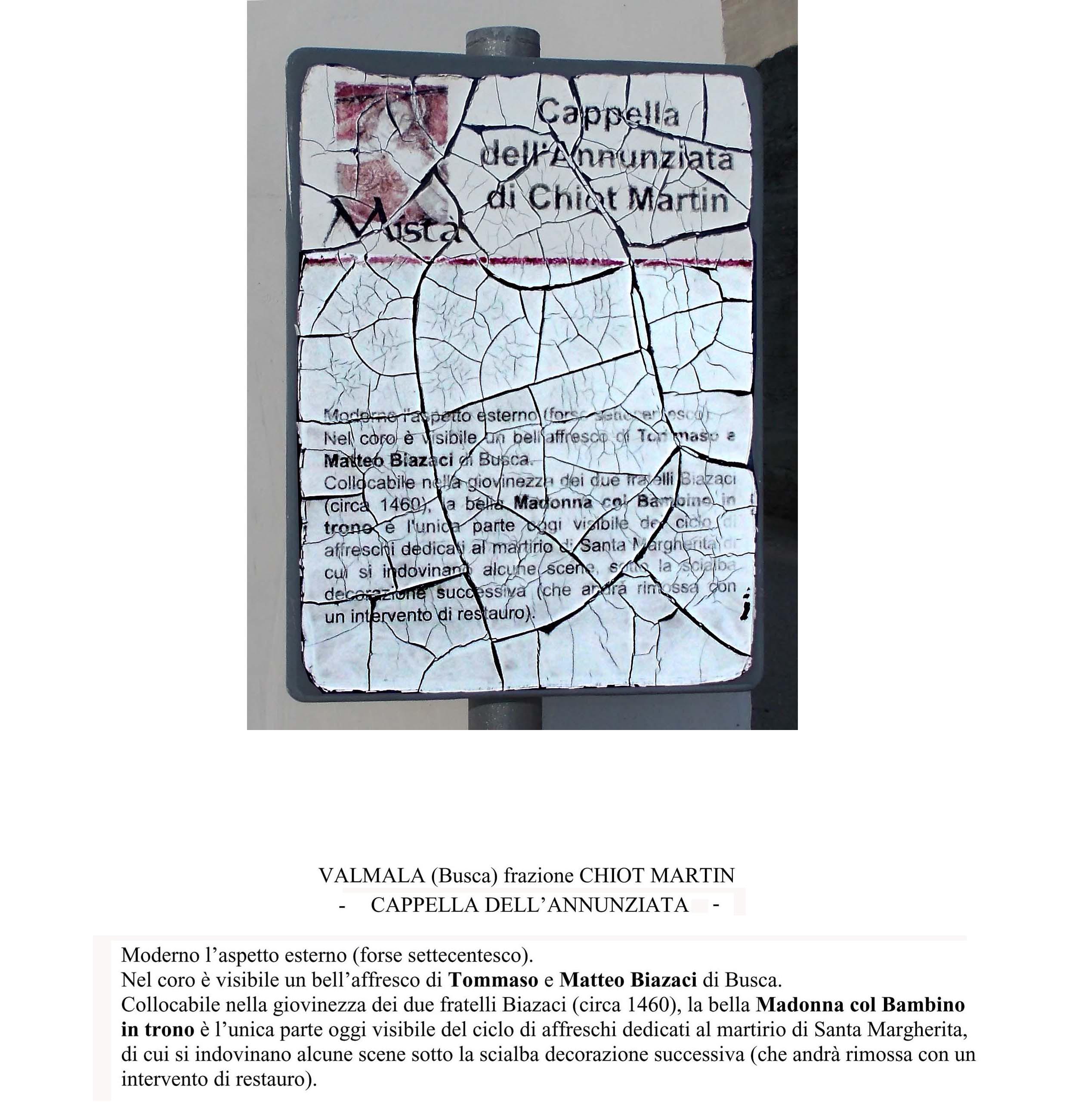 La Cappella si trova a Chiot Martin, Valmala (CN), nota come Annunciata. Periodo prevalente: XV secolo. Livello di interesse: 1 (Interessante). Elementi presenti: pittura. Da vedere: interno.