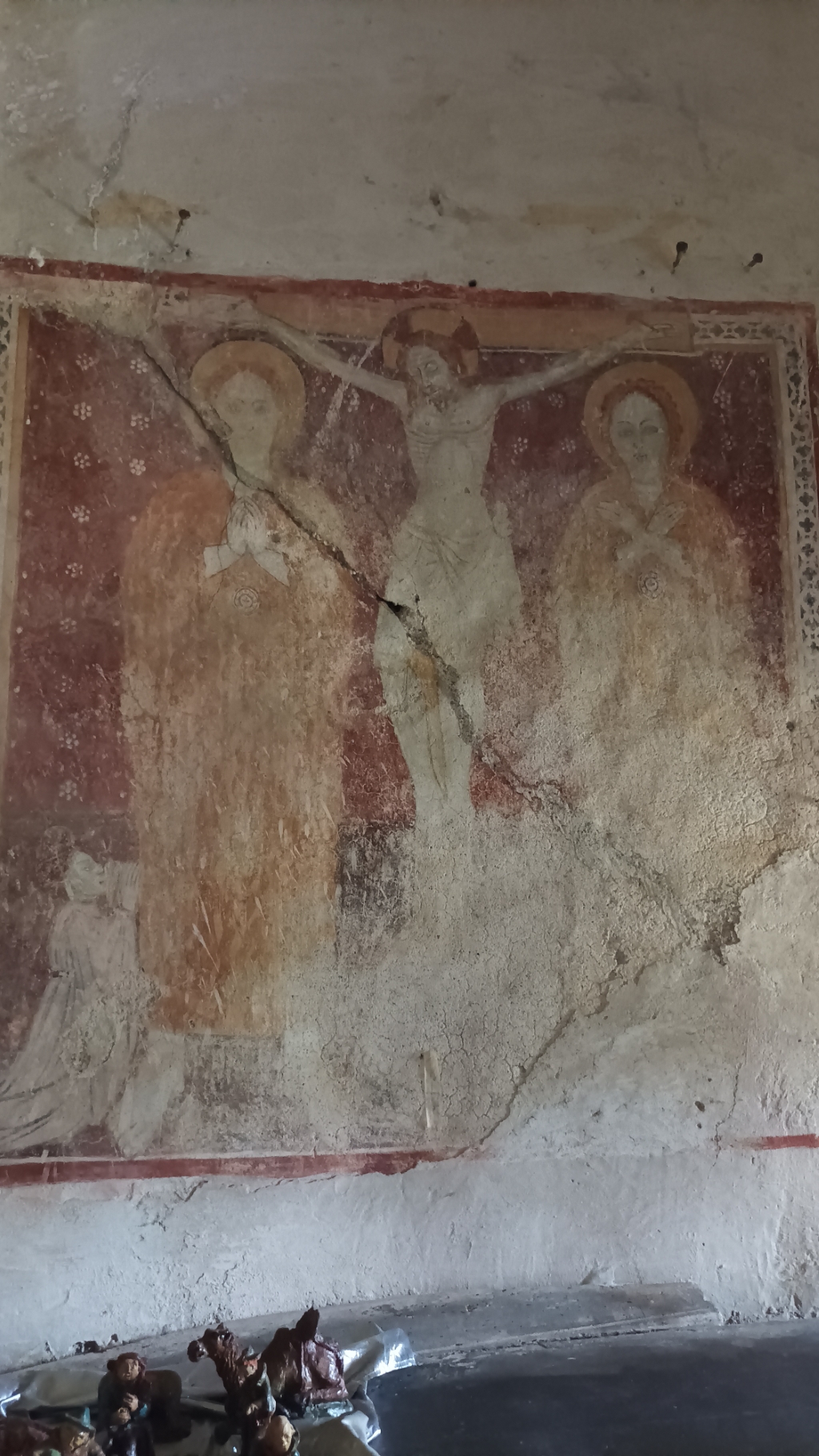 affresco attribuito al pittore marchigiano Domenico della marca di Ancona e realizzato negli anni trenta del '400, rappresentante Cristo in croce tra due Santi. |