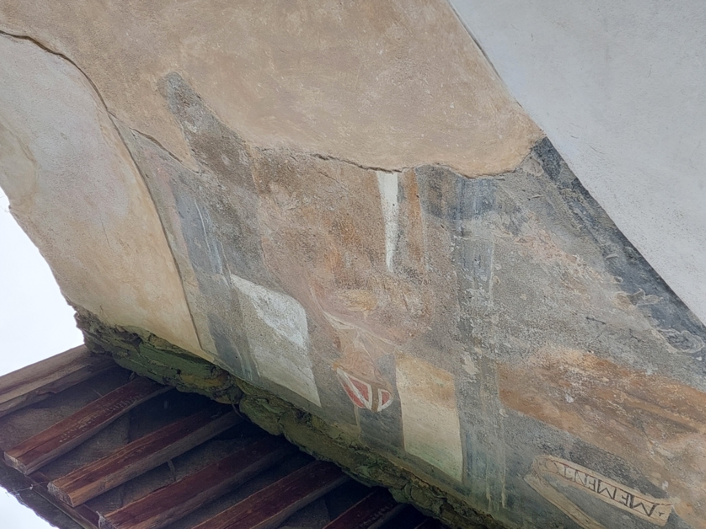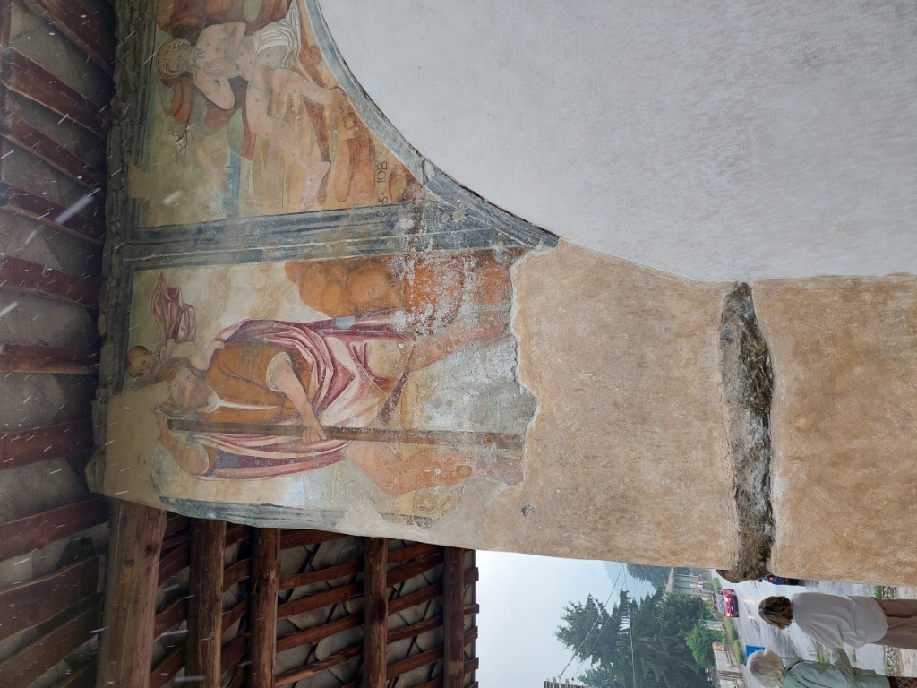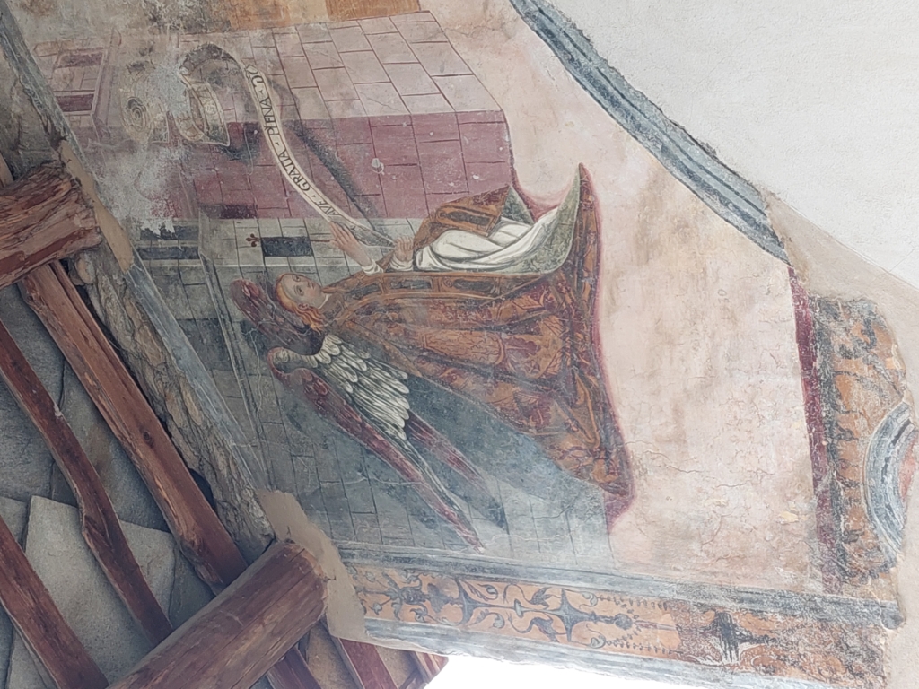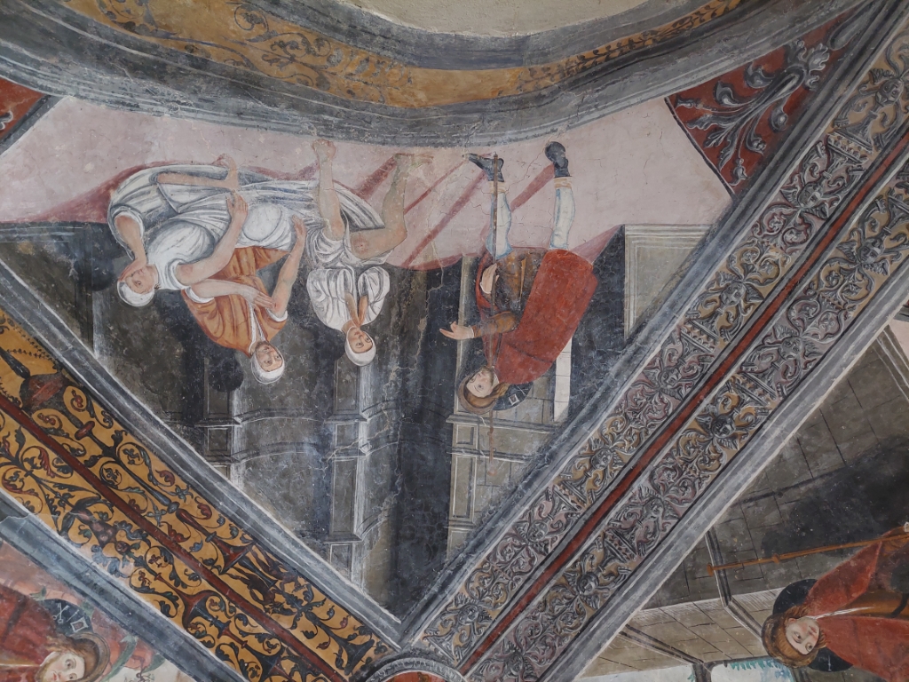 Esterno: affreschi tra cui San Giobbe, San Cristoforo, Memento Mori, San Lazzaro e San Bernardo da Mentone. |