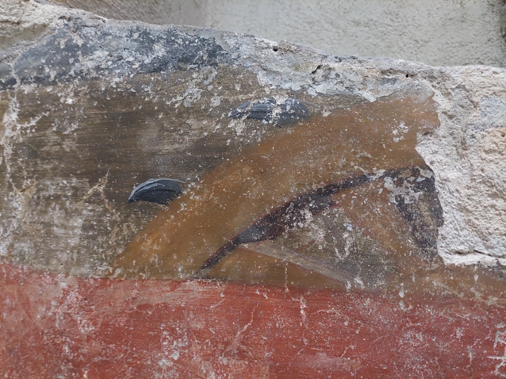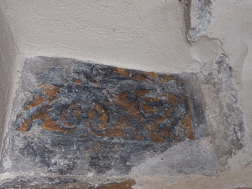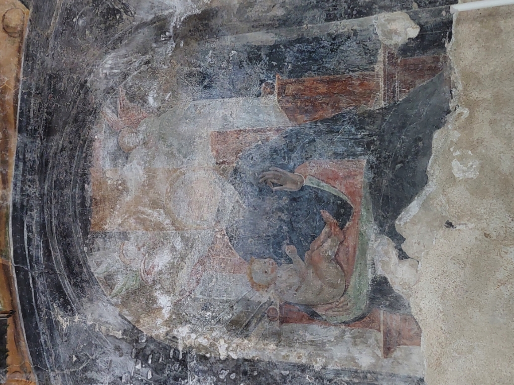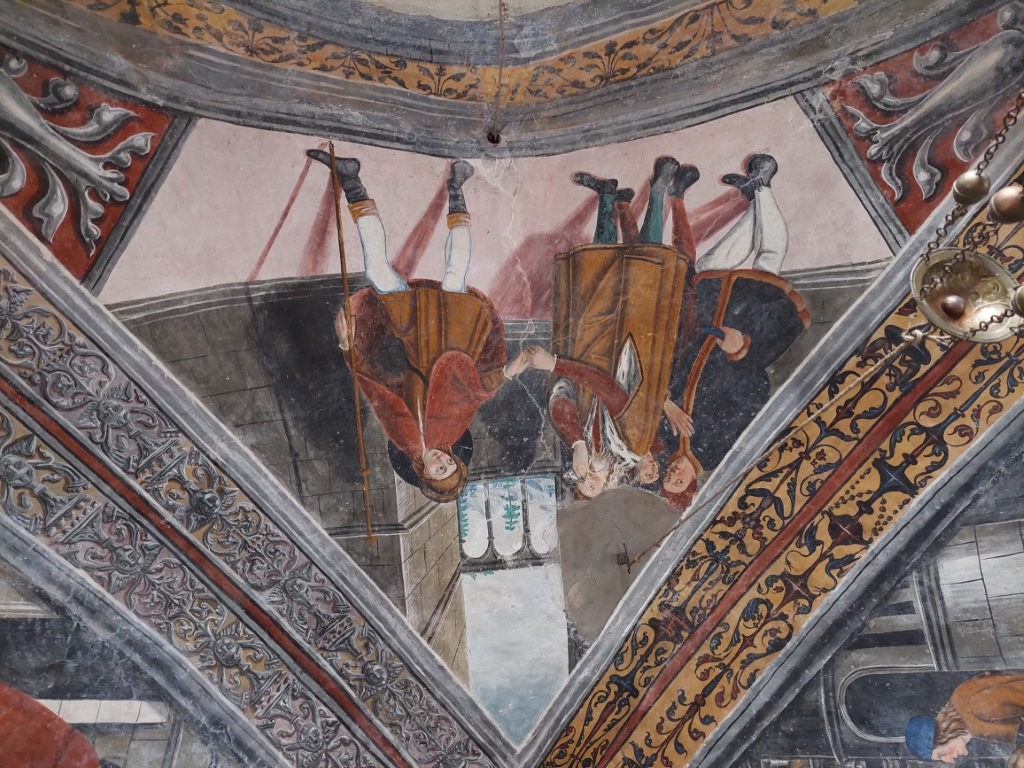 Esterno: affreschi tra cui San Giobbe, San Cristoforo, Memento Mori, San Lazzaro e San Bernardo da Mentone. |