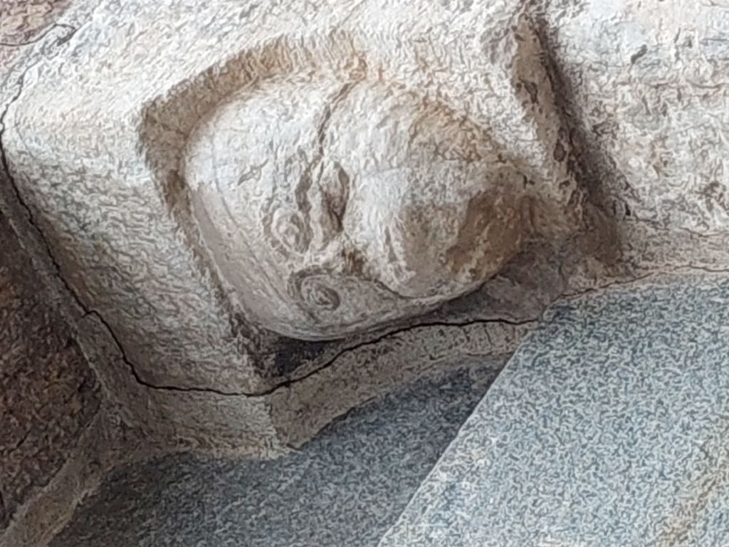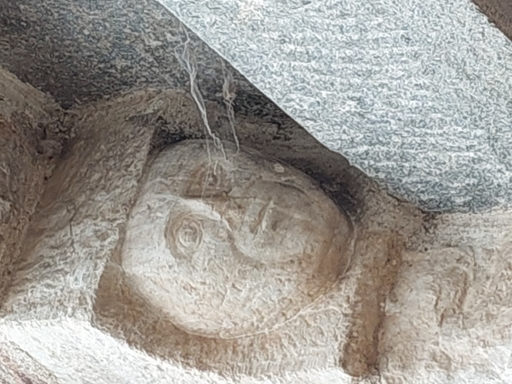 Esterno: portale di marmo bianco proveniente dalle locali cave, con capitelli rappresentanti volti umani. |