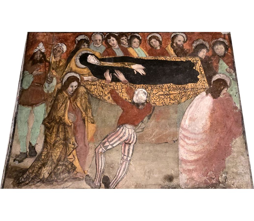 Nell’iconografia bizantina la Vergine è rappresentata distesa su un letto funebre, con il corpo in posizione frontale e il capo reclinato, mentre intorno gli Apostoli manifestano dolore e venerazione.