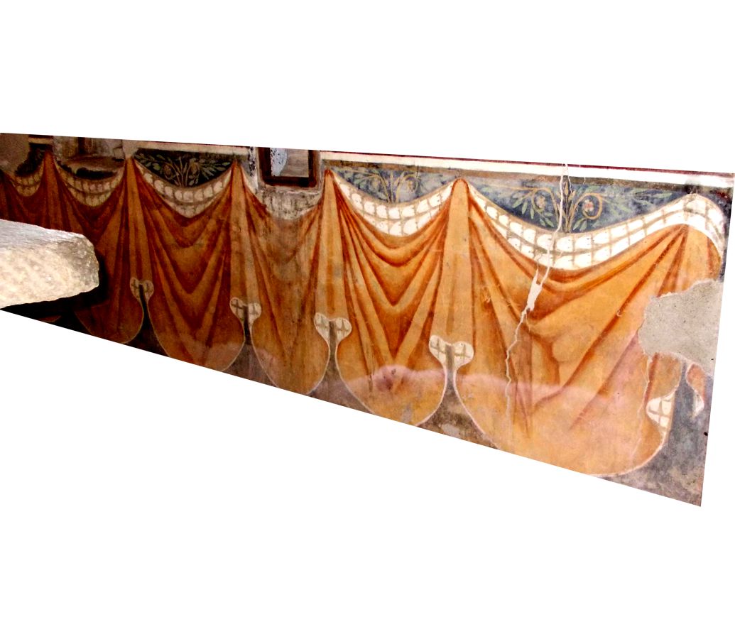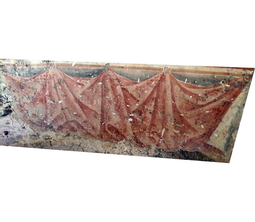 Si tratta di una finta tenda, resa con pieghe, cordoni e anelli, che imita un drappo prezioso steso a protezione e al tempo stesso a delimitazione dello spazio sacro.
