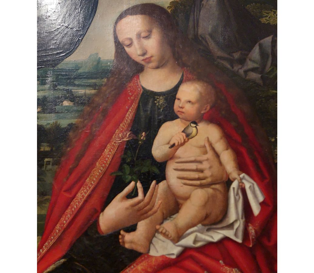 Nelle scene sacre di ambito nordico o fiammingo può apparire posata su un ramo o presso figure di bambini o madonne, con valore di vita, purezza e rinascita.