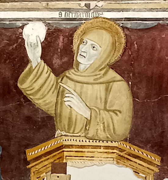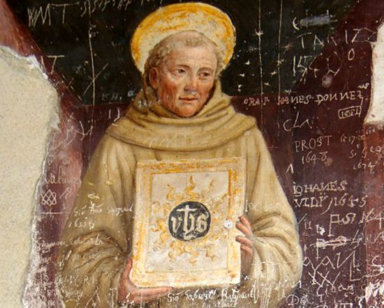 Il Santo di questo mese, Bernardino da Siena, viene spesso rappresentato con il monogramma IHS di Cristo. Fu molto attivo in Piemonte e Lombardia. Nacque a Massa Marittima nel 1380 e morì ad Aquila nel 1444. Orfano, fece studi approfonditi ed entrò nell'ordine francescano.