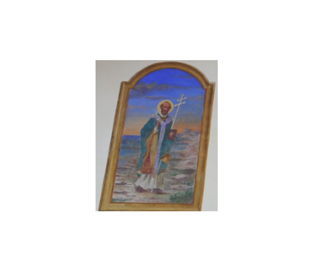 Esterno: affresco della Madonna con Bambino e due Santi con cornice ad arco in cotto. Si tratta di una lunetta dipinta decorata da cornice in cotto fiorentino. Al centro: dipinta su un finto velo è rappresentata la Madonna con Bambino. Da notare il vestito del Bambino, molto sottile e delicato. A destra: San Giovanni Battista, con la capigliatura un po’ arruffata, come nelle raffigurazioni del periodo. A sinistra: santo monaco, forse benedettino, vista la tunica nera, comunque di difficile interpretazione. |