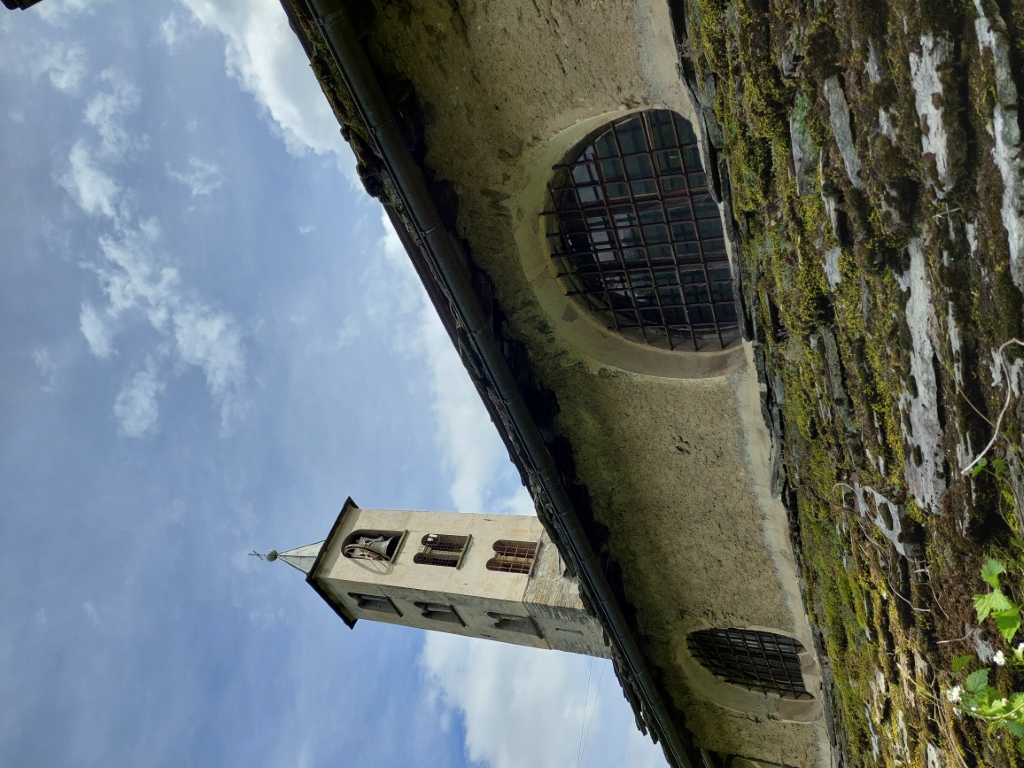 Campanile: romanico della chiesa originale aperto da bifore con capitelli a stampella. |