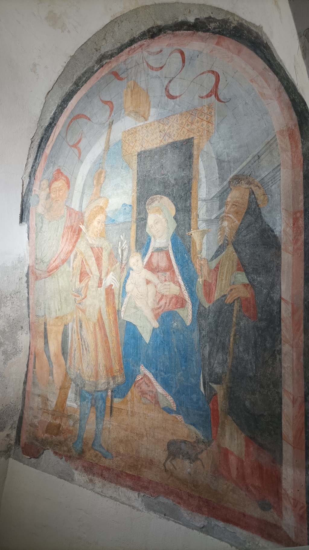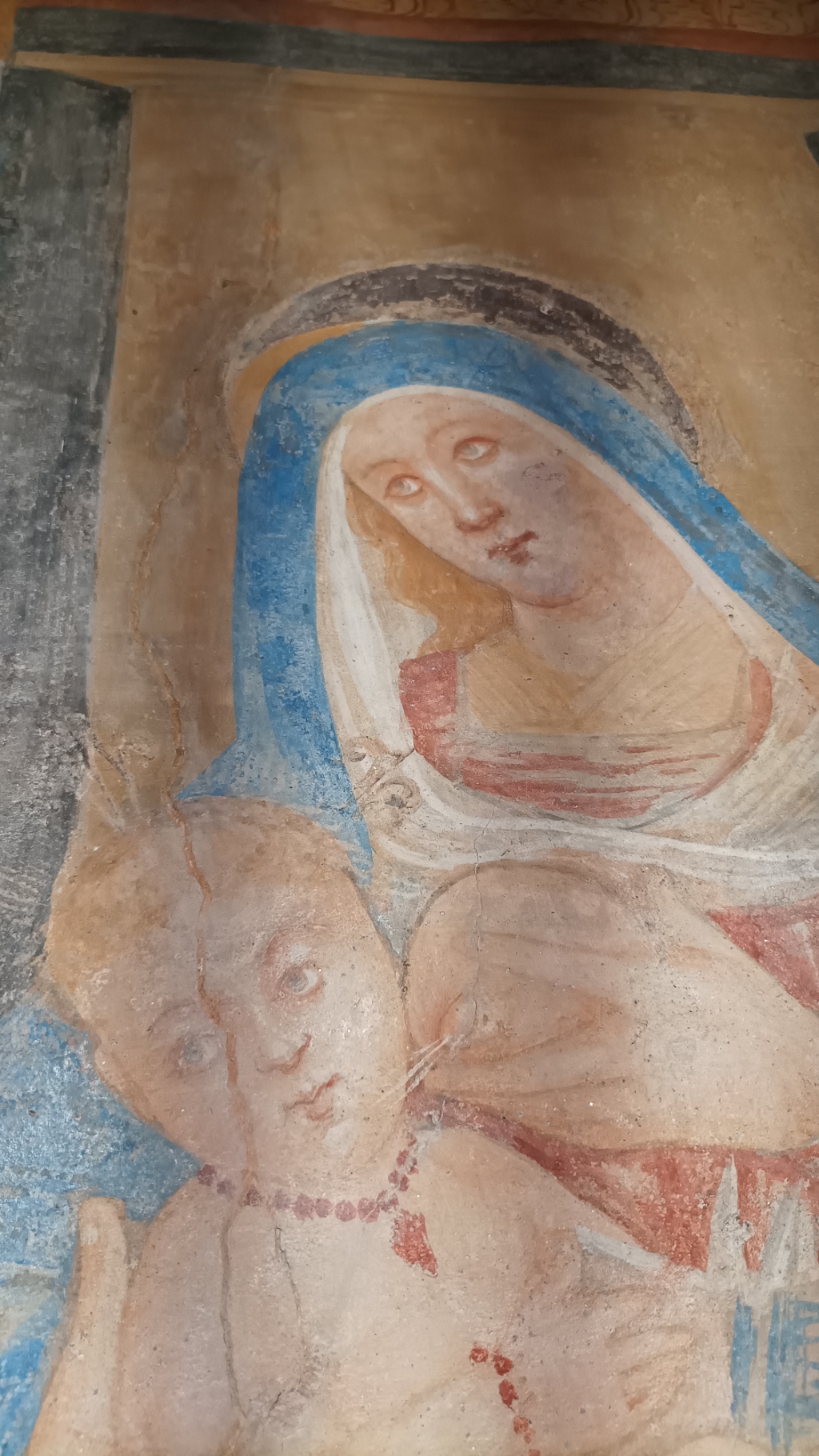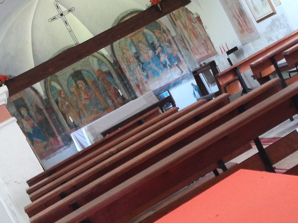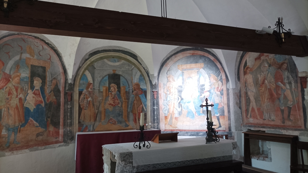 Interno: affreschi di autore ignoto rappresentanti l'adorazione della Vergine da parte di Santi. |