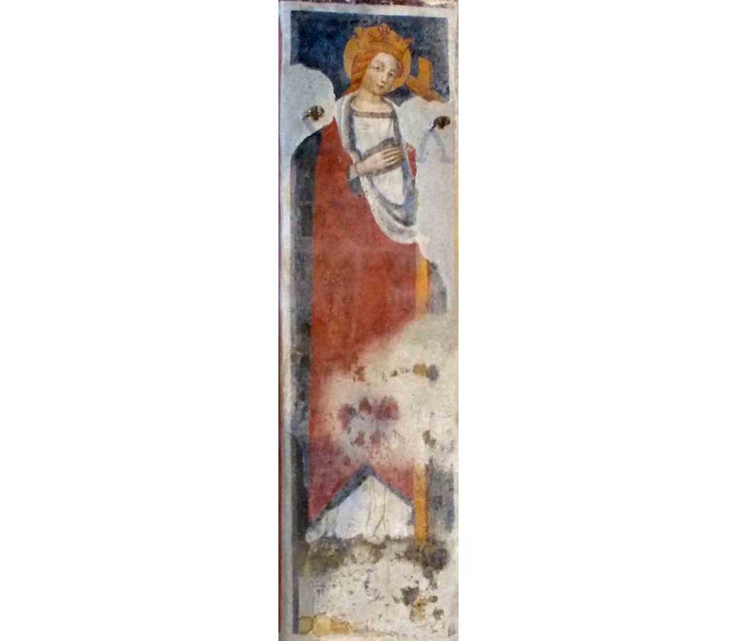 Interno: a pianta rettangolare, diviso in due vani da un grande arco, abside quadrata e pavimento in terra battuta, conserva affreschi del '400, tra i quali due trittici raffiguranti La Vergine col Bambino tra San Rocco e San Sebastiano e la Vergine col Bambino tra Santa Elena e San Giovanni Battista. Sulla parete destra tracce di affreschi probabilmente del primo quarto del IX secolo raffiguranti la Vita di San Lorenzo: tre teste di giovani a capo scoperto; tre teste aureolate; un particolare di un trono e una fascia di perline e fuseruole. |