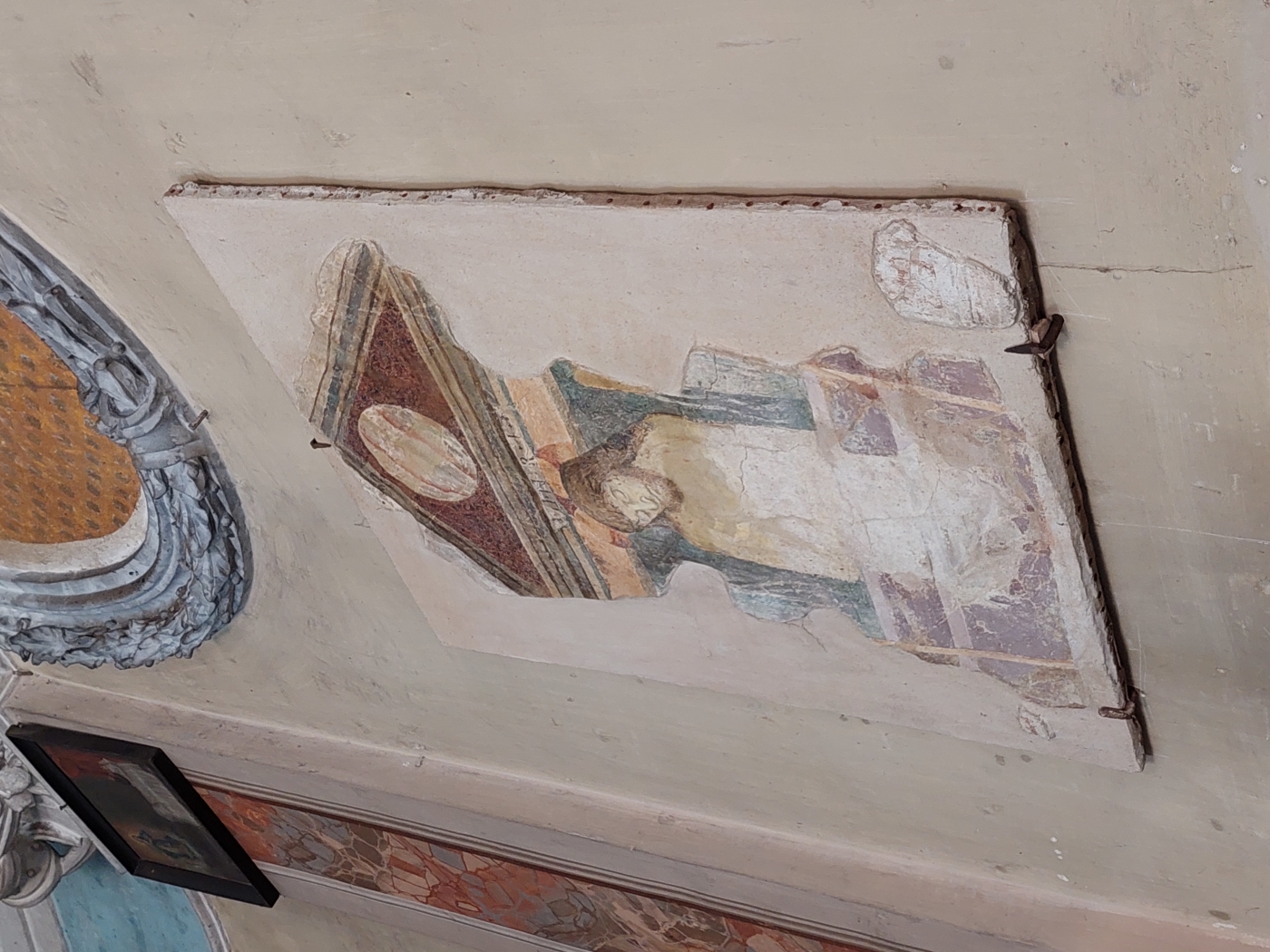 Interno: dietro l'altare Crocifissione datata 1462. Affresco staccato del Cristo che esce dal sepolcro. |