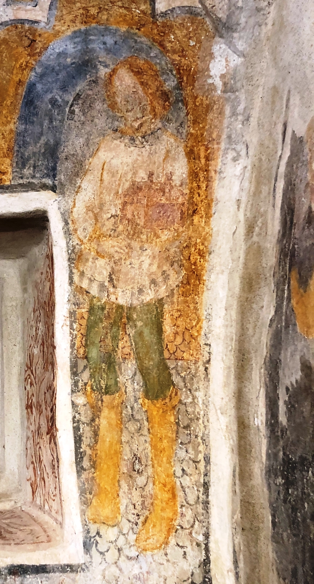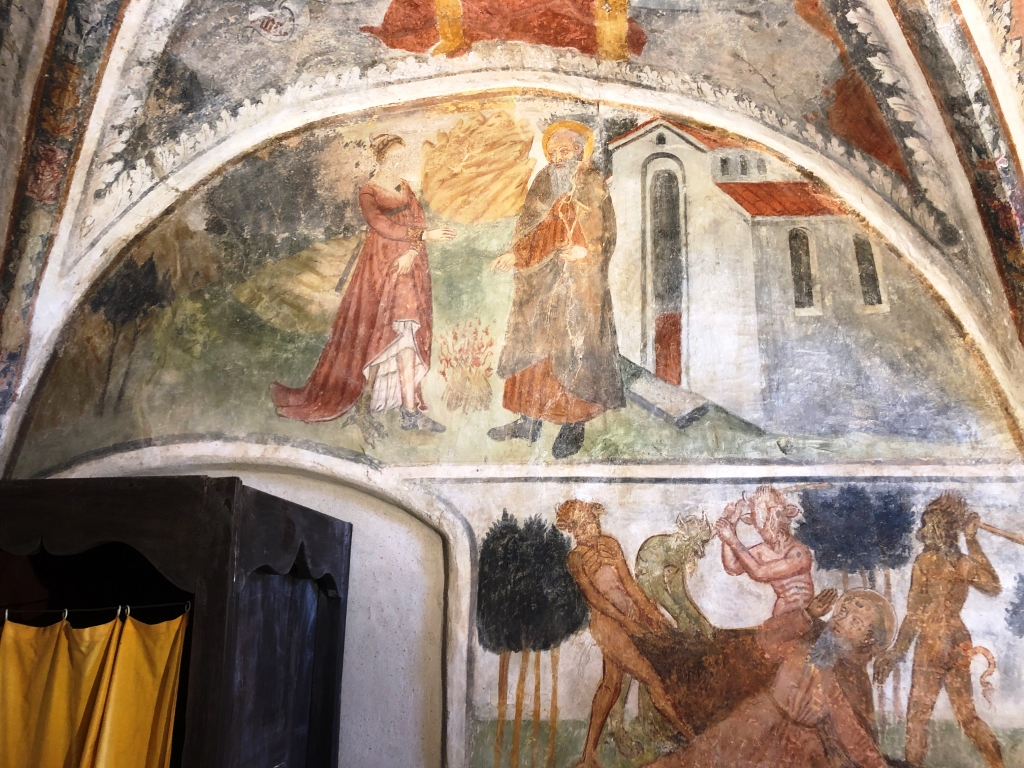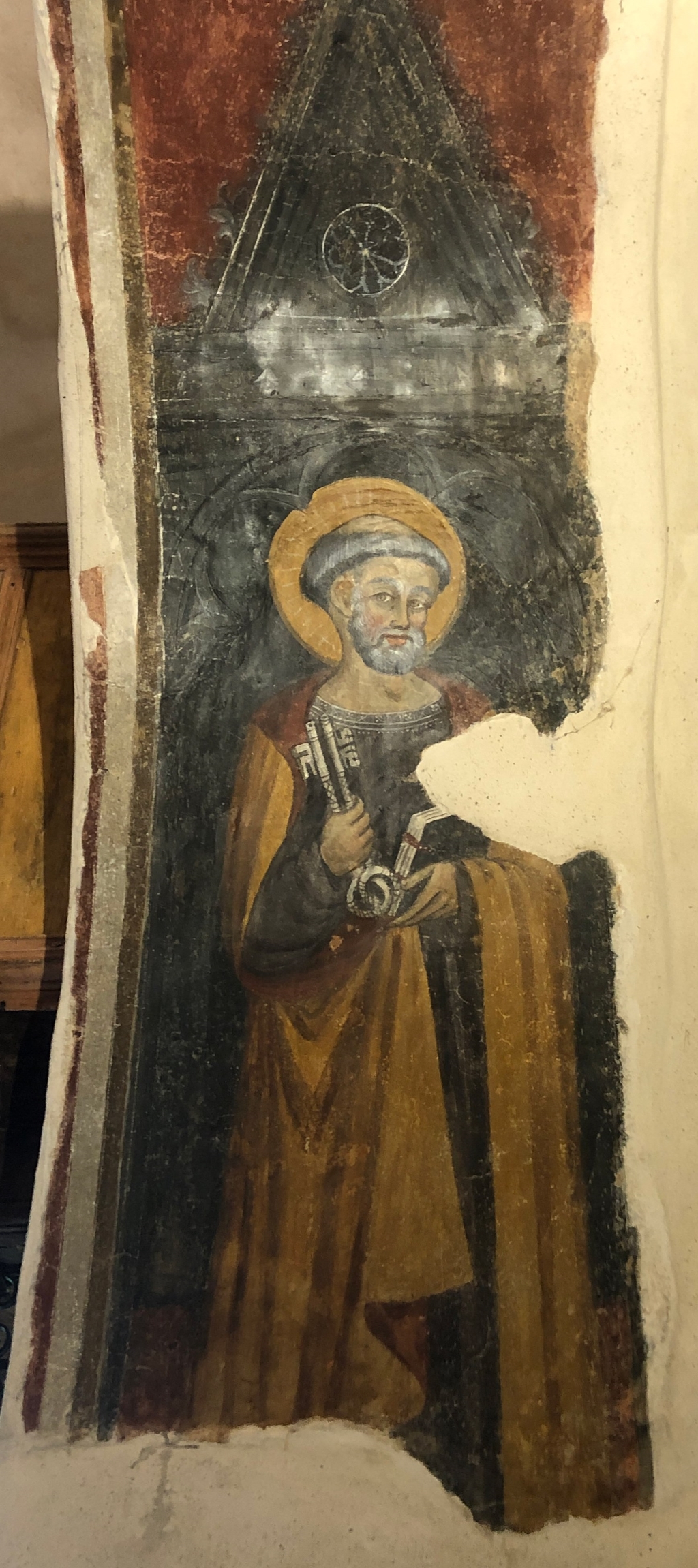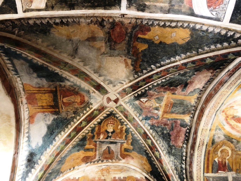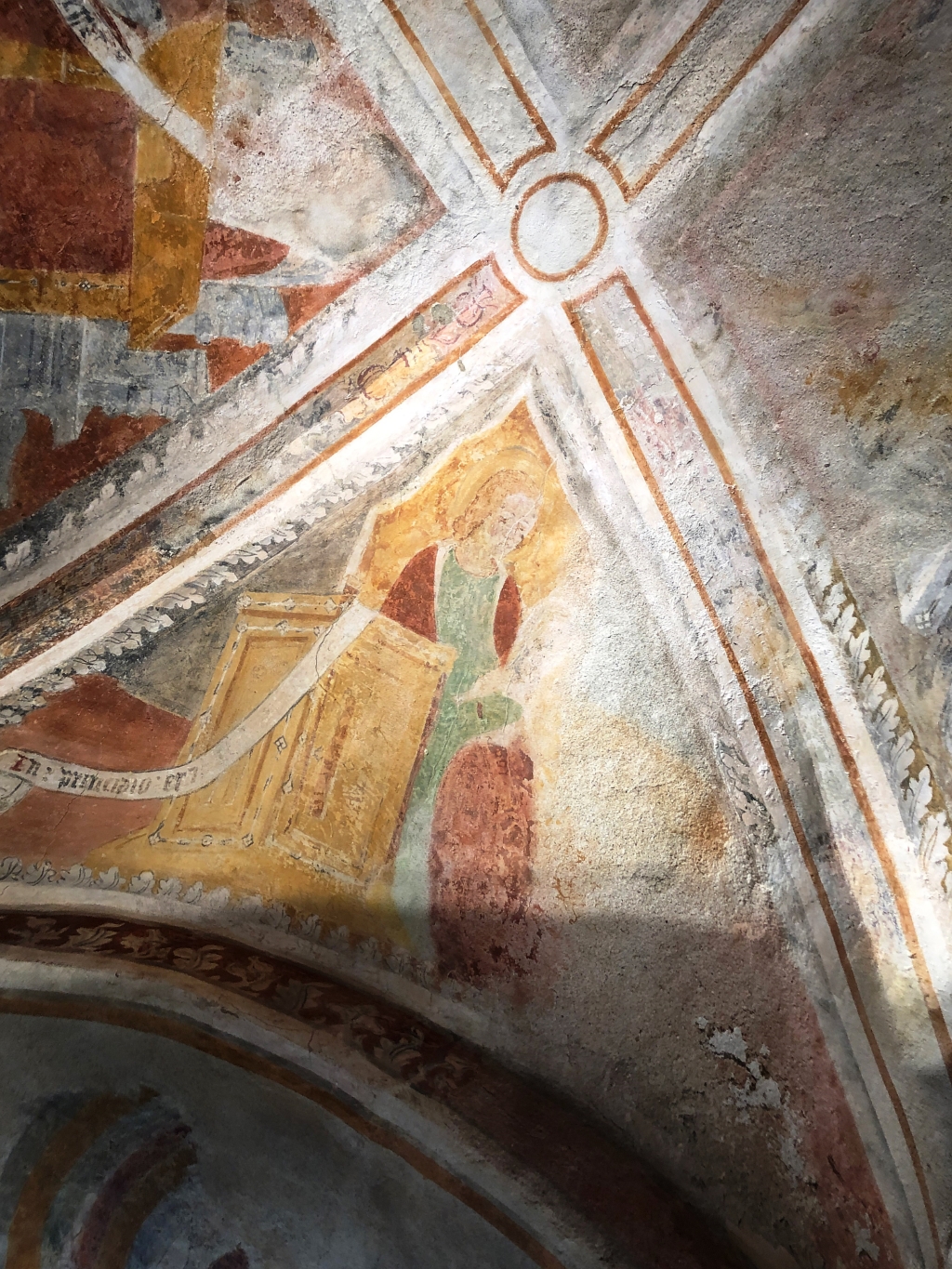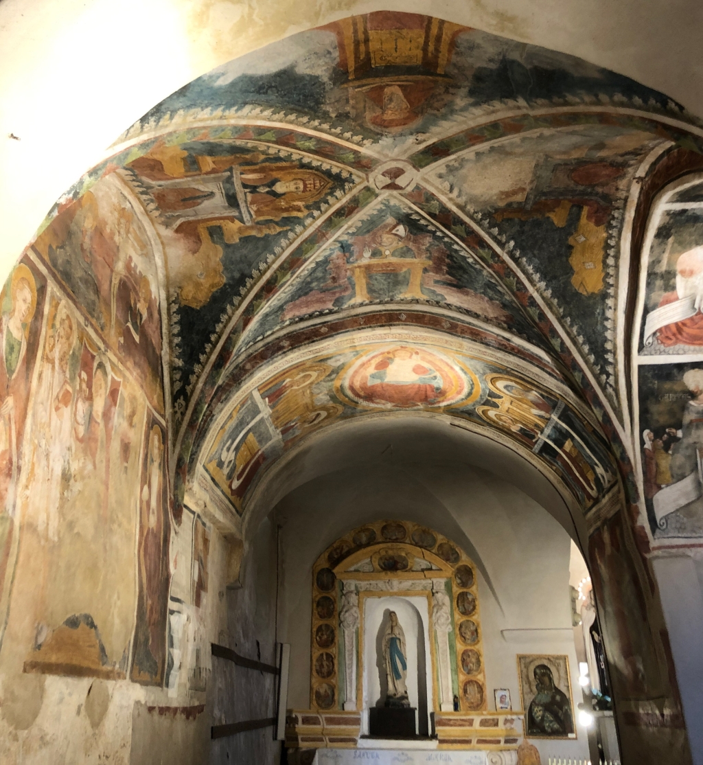 Interno: capitelli e affreschi mal conservati opera del pittore Segurano Cigna (notizie 1450-1478) datati 1487 e firmati Seguranus Cigna de Monteregali; nella parete di fondo e nella volta Dottori della Chiesa. |