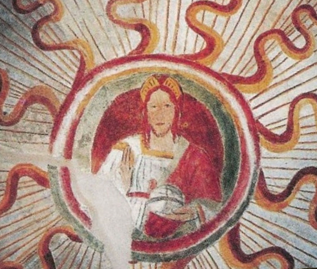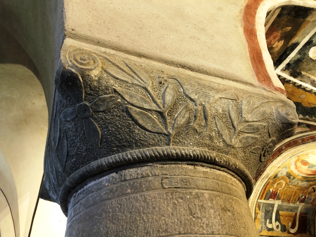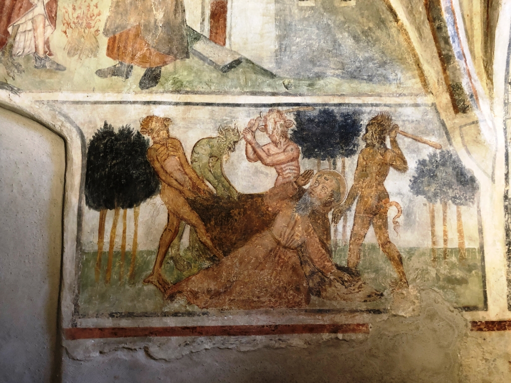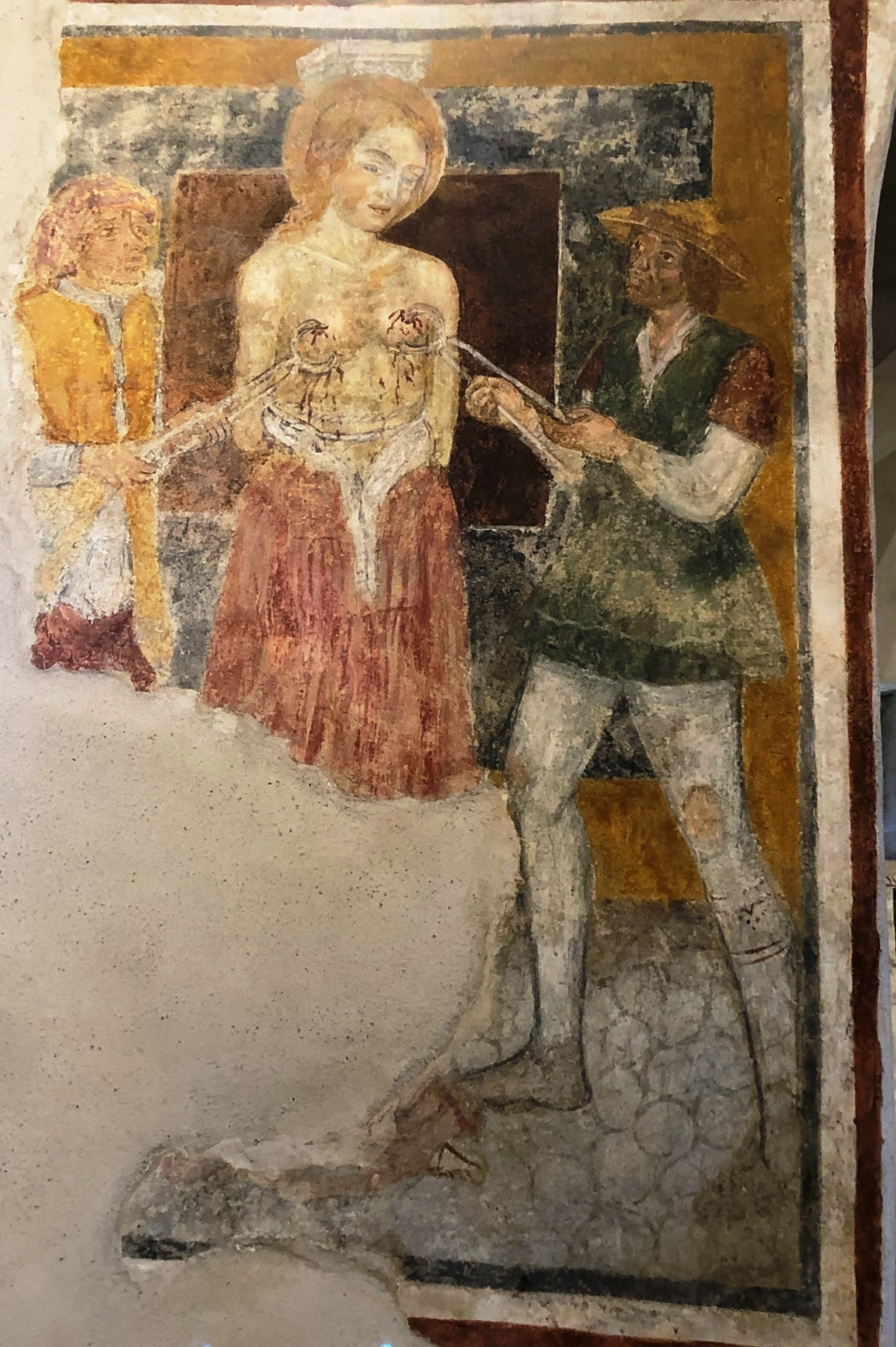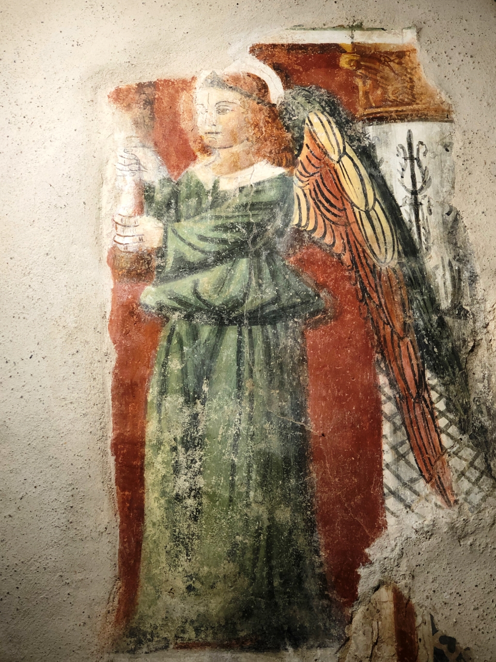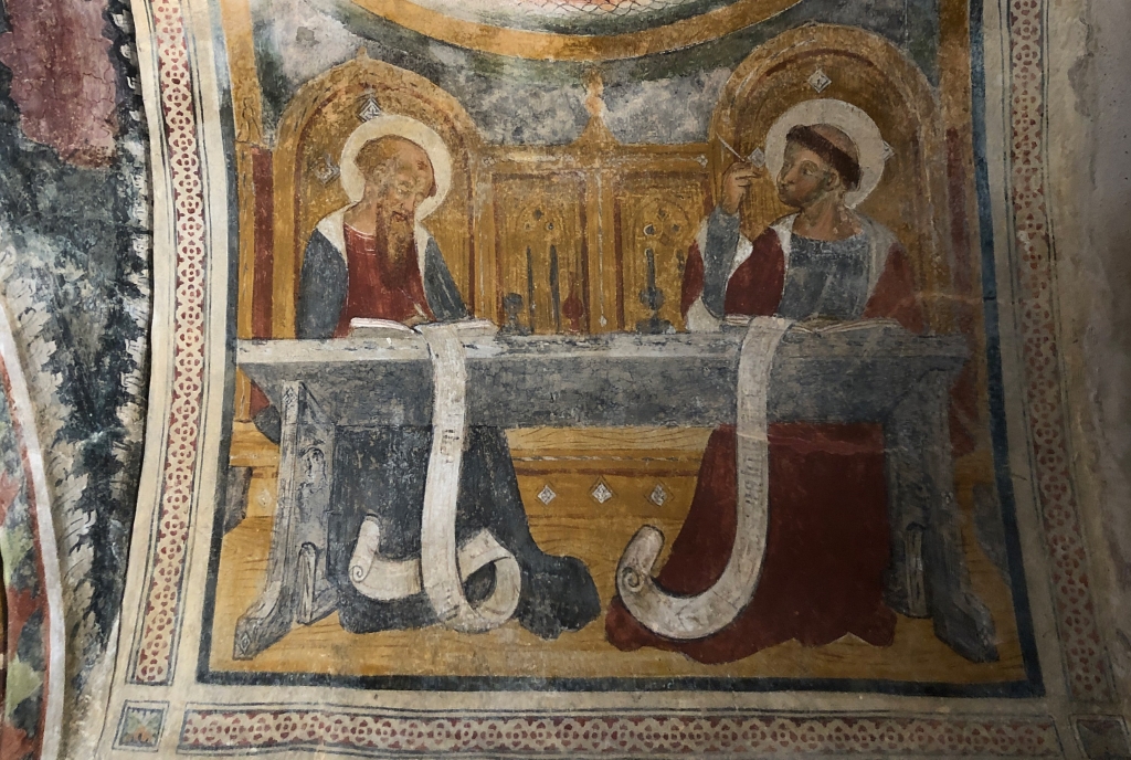 Interno: capitelli e affreschi mal conservati opera del pittore Segurano Cigna (notizie 1450-1478) datati 1487 e firmati Seguranus Cigna de Monteregali; nella parete di fondo e nella volta Dottori della Chiesa. |