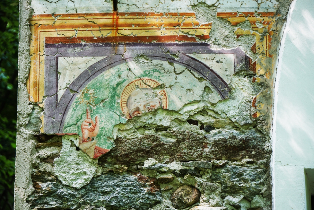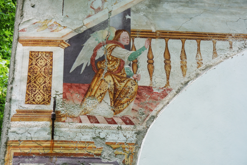 Esterno: in facciata resti affreschi dei santi titolare e angeli. |