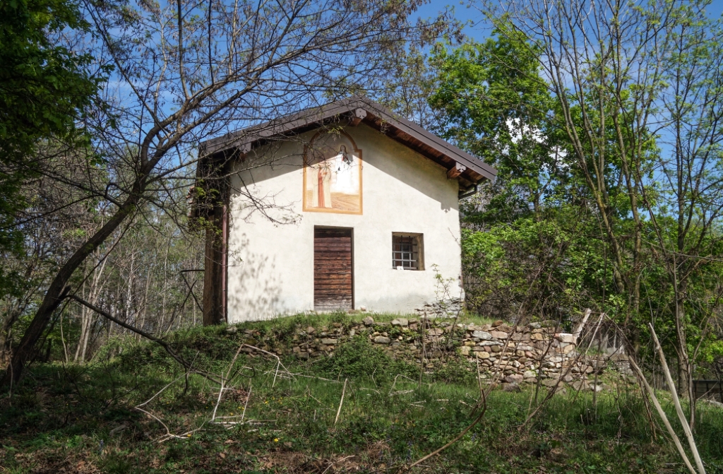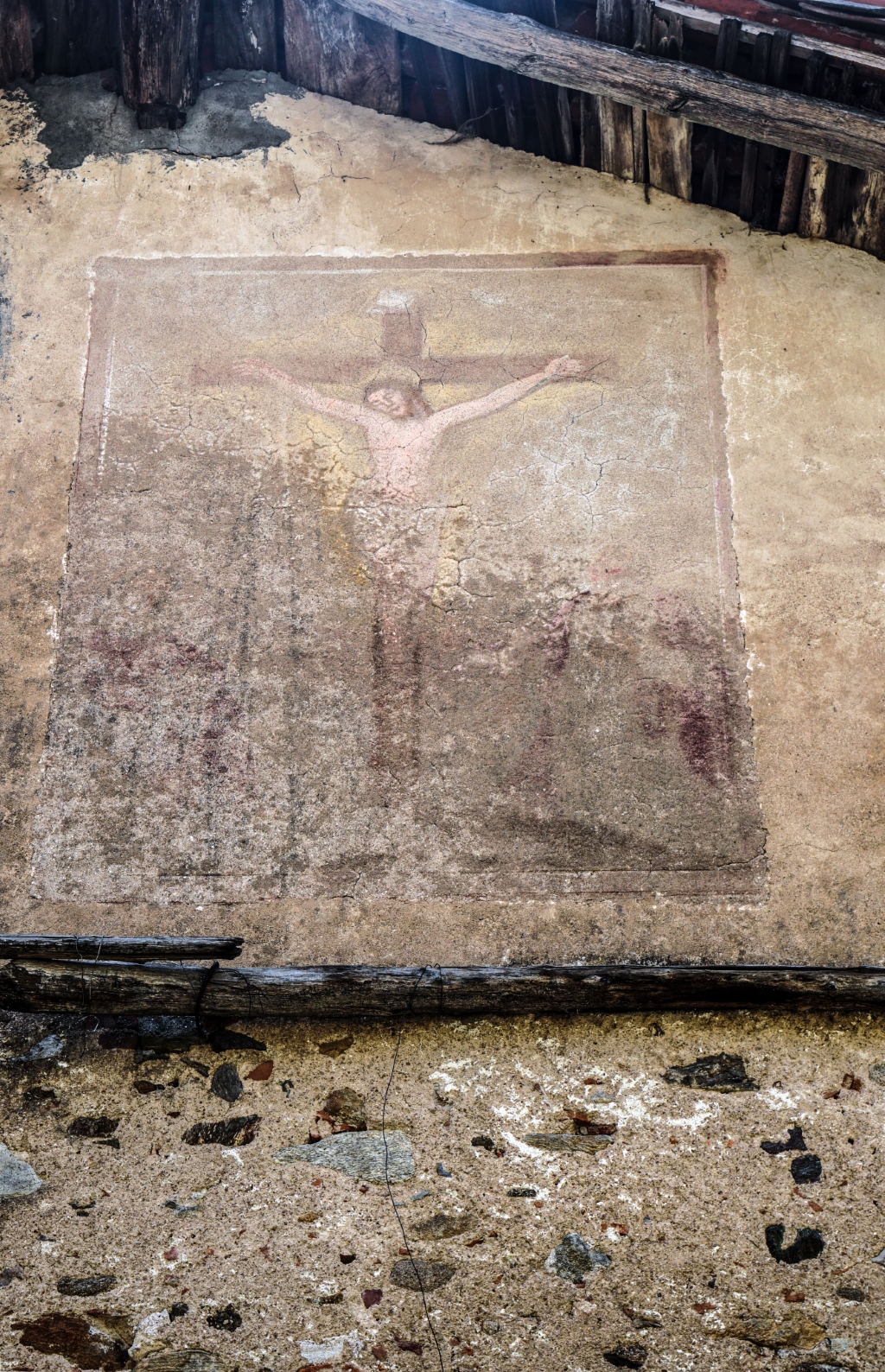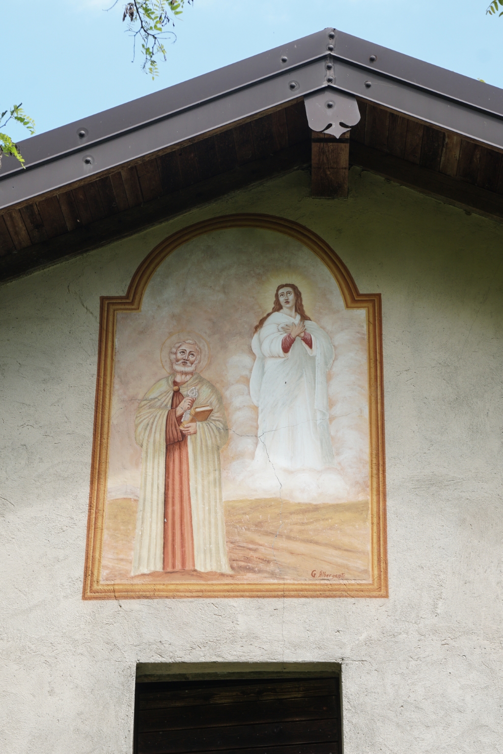 Esterno: affresco di crocifissione in facciata est e San Pietro a firma G. Albergante in facciata ovest. |