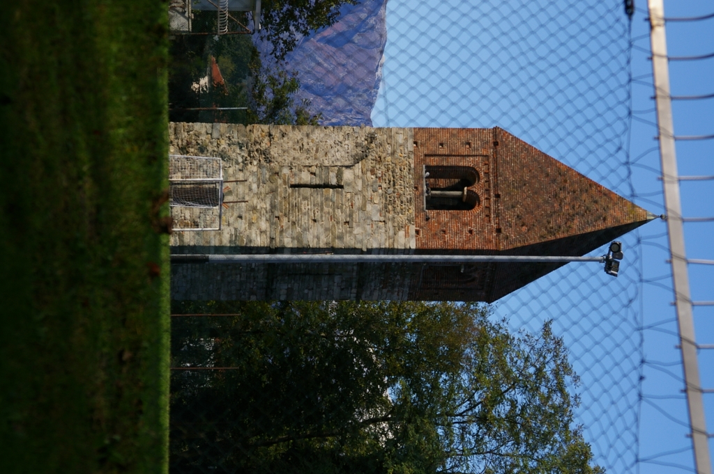 Campanile: unica parte superstite della chiesa dell'XI secolo. Si innalza su un basamento di pietra grigia con strette feritoie e decorazioni geometriche di pietra e mattoni. Cella campanaria con quadruplice coppia di bifore. Cuspide quadrangolare in mattoni. |
