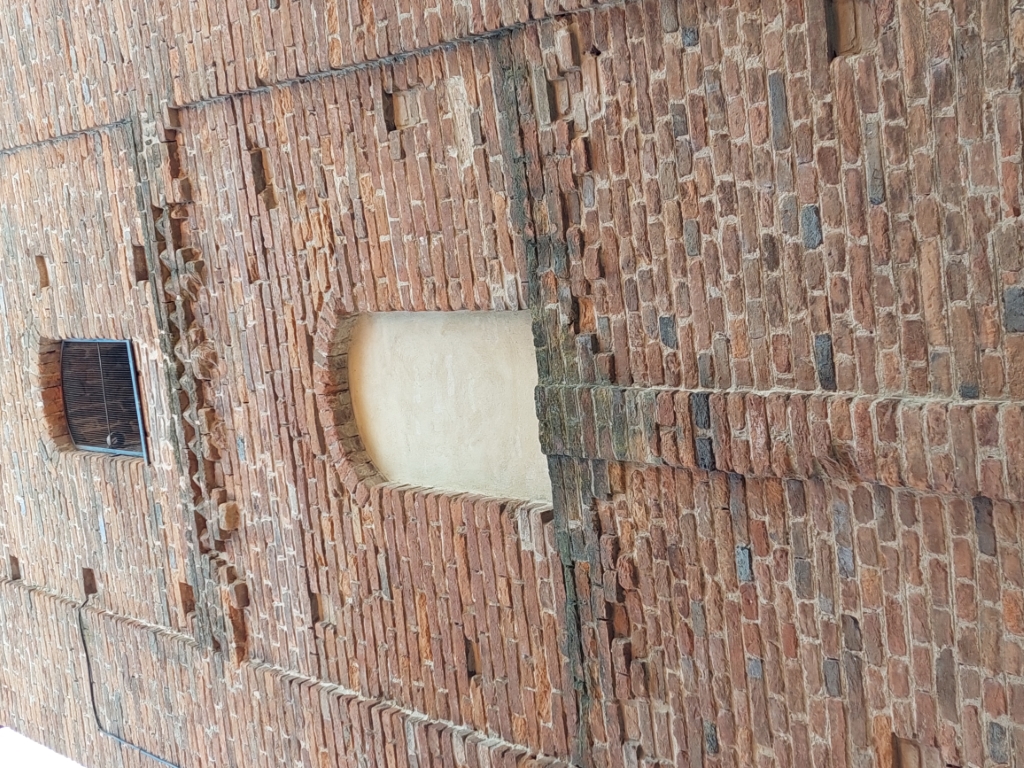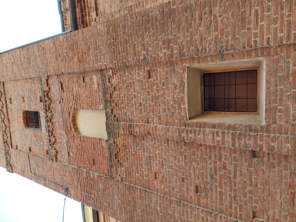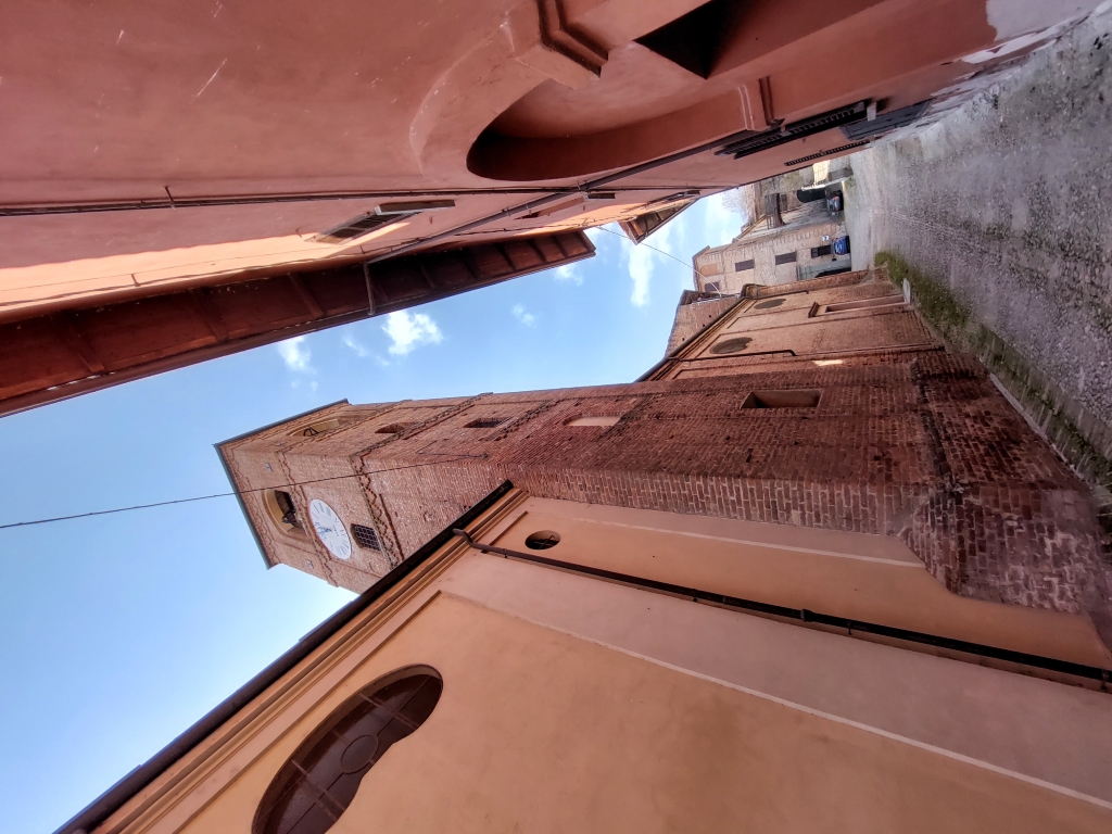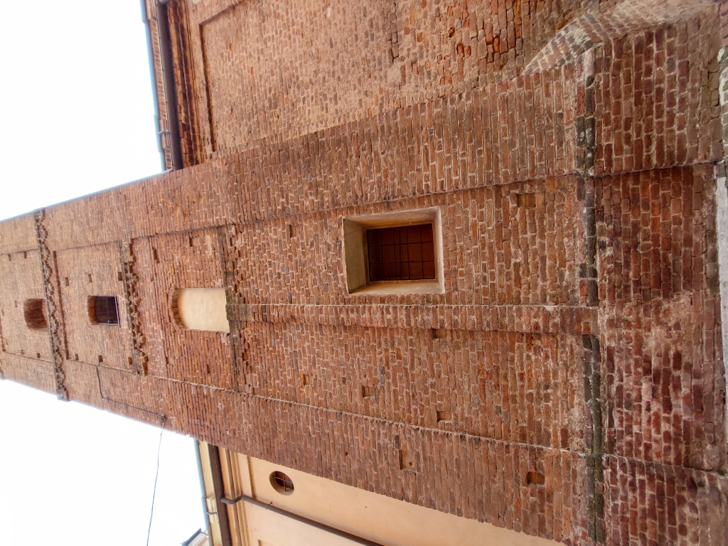 Campanile: in mattoni, inferiormente romanico, superiormente del '300 con finestre ad arco acuto e cornici in cotto. |