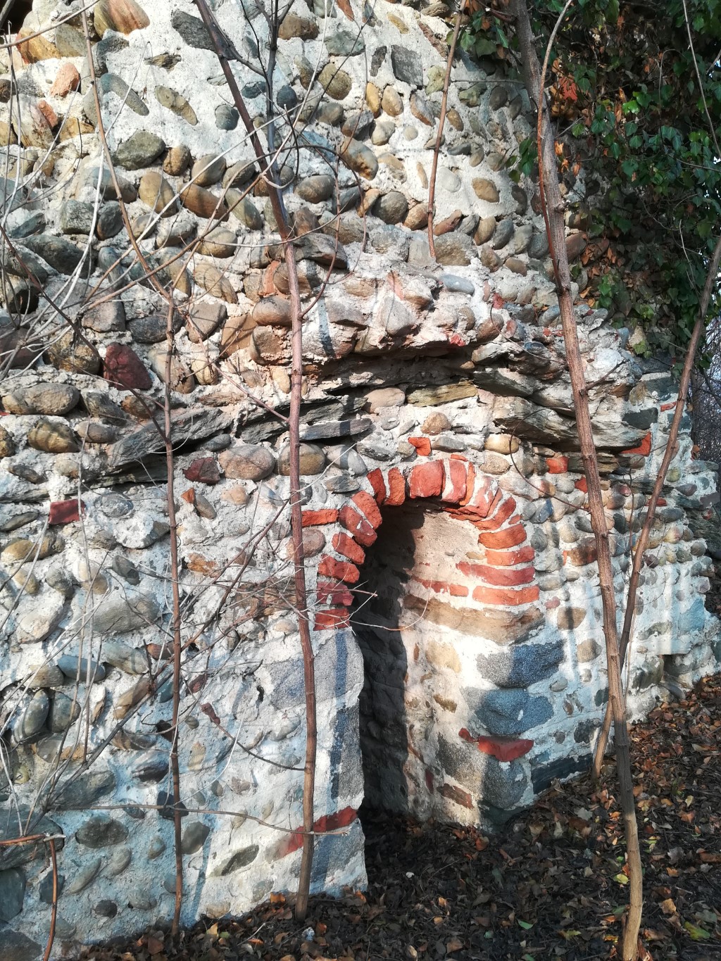 Campanile: resti del campanile romanico costruito con ciottoli di torrente disposti a lisca di pesce e archetti pensili in cotto. |