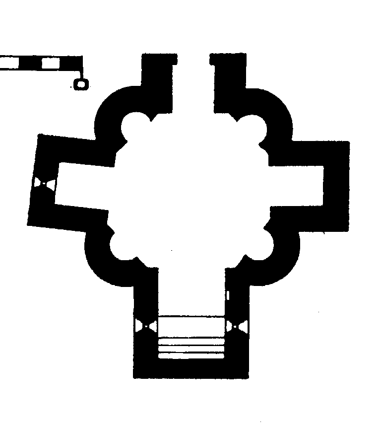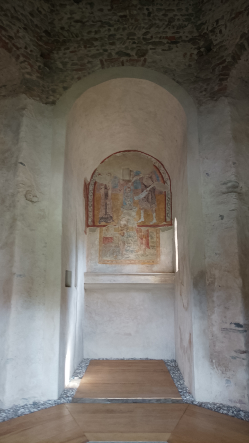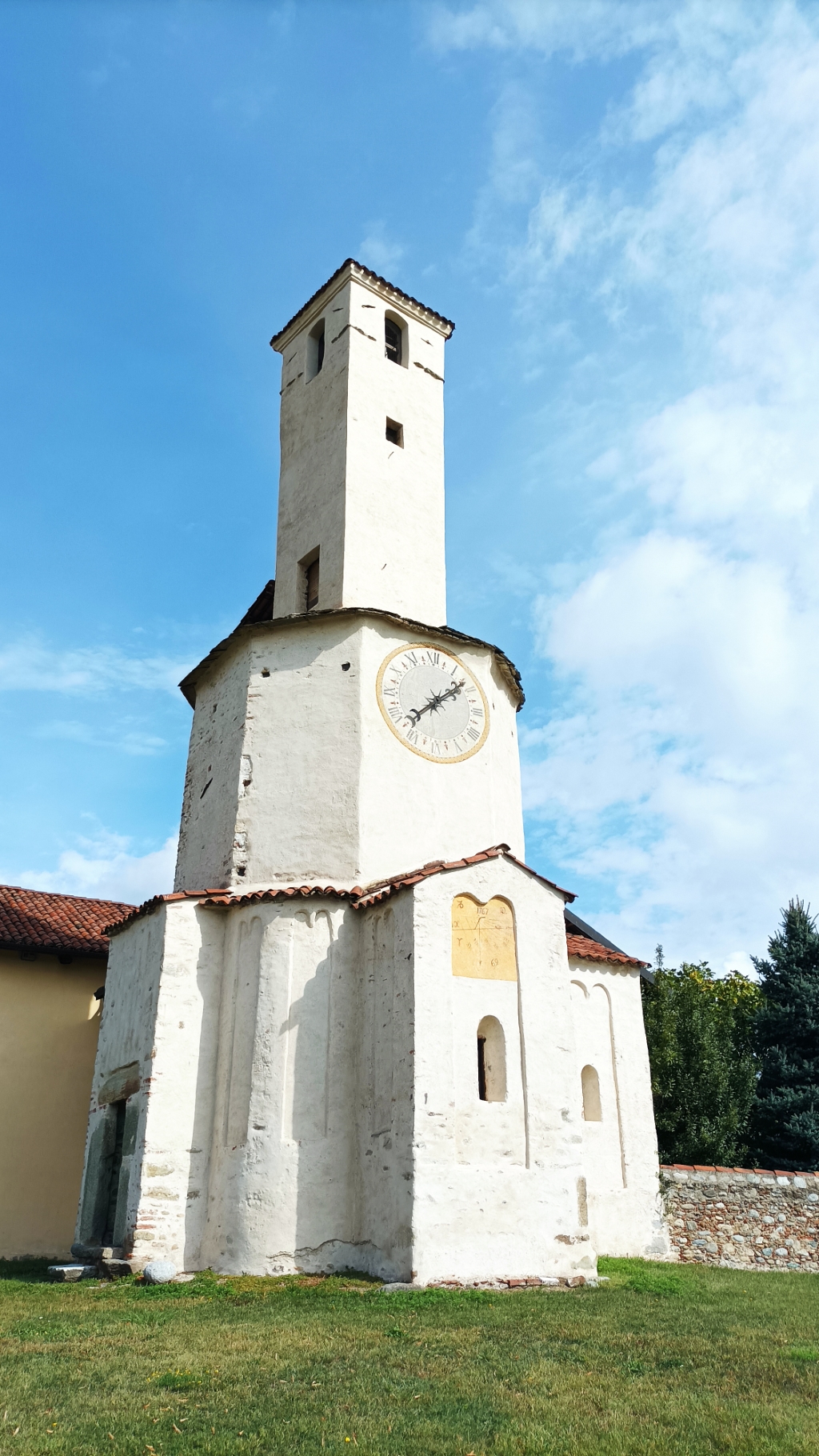 Notizie generali: risalente al tardo X secolo - inizio XI, si presenta a pianta centrale ottagonale con lati di diversa lunghezza sui quali si aprono otto absidi a sezione rettangolare o semicircolare. La profondità irregolare delle nicchie permette la formazione di una base a croce greca. Sovrasta la base un tiburio di stile lombardo e una volta emisferica. La pianta ha analogia con il battistero di Lomello (PV) e la struttura muraria lo accomuna a quello di San Lorenzo a Settimo Vittone (TO). Il campanile sulla cupola è di epoca barocca. |