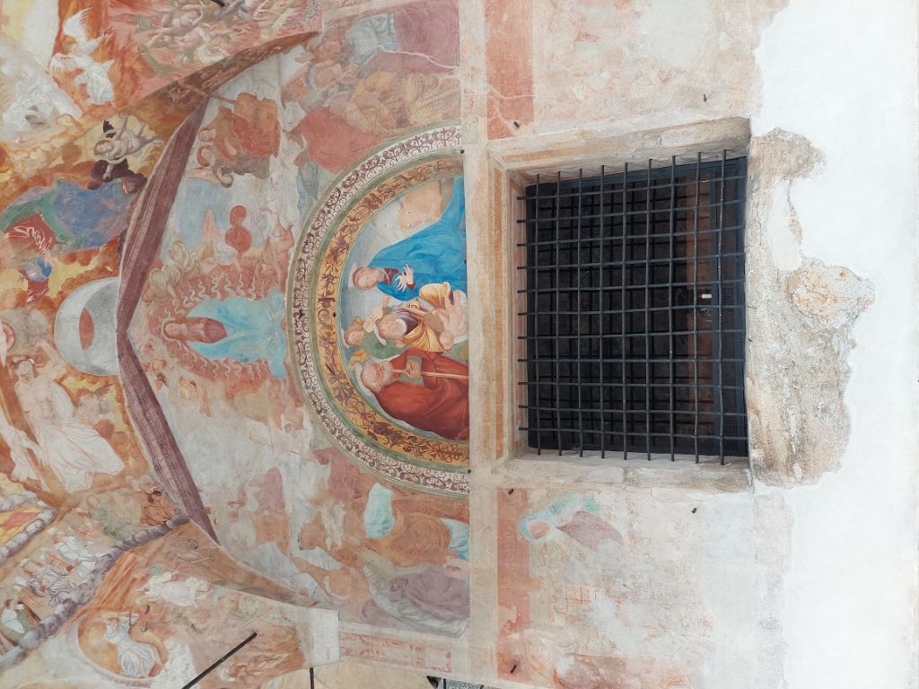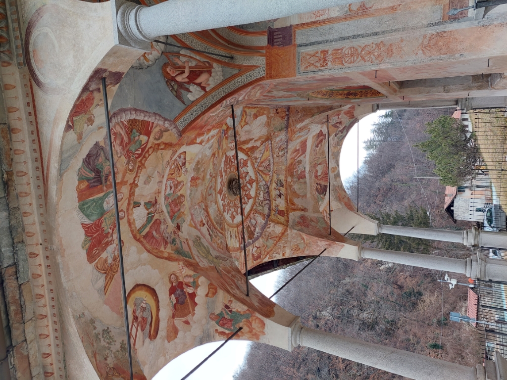 Esterno: in facciata, nella lunetta Adorazione del Bambino (1517) e a sinistra Natività di Gaudenzio Ferrari (1477-1546); a destra Transito di Maria; al di sopra del portale Assunta, Apostoli e un angelo che porge il singolo a San Tommaso attribuiti a Andrea Solario (prima 1473-dopo 1520); nella fronte Creazione dell'uomo, Peccato originale e cacciata dal paradiso; nella volta sopra il portale Paradiso e la corona preparata per Maria, Purgatorio e inferno; nel lato destro Sposalizio di stile affine a quello di Giulio Cesare Luini. |