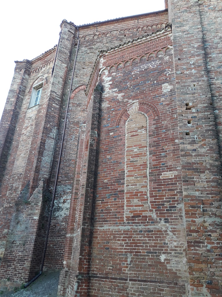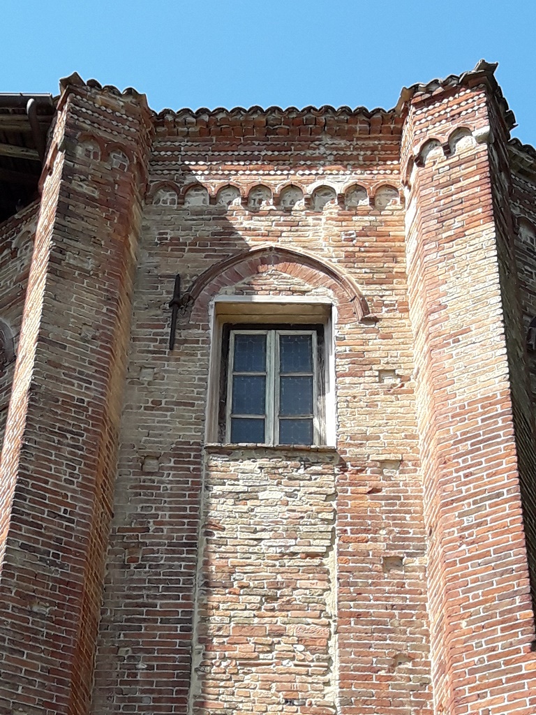 Esterno: conserva della chiesa del 1272 l'abside partita da robuste lesene e decorata da archetti pensili e in cui si vede, dalla finestra dell'abside laterale destra, un capitello gotico con scene di vendemmia. |