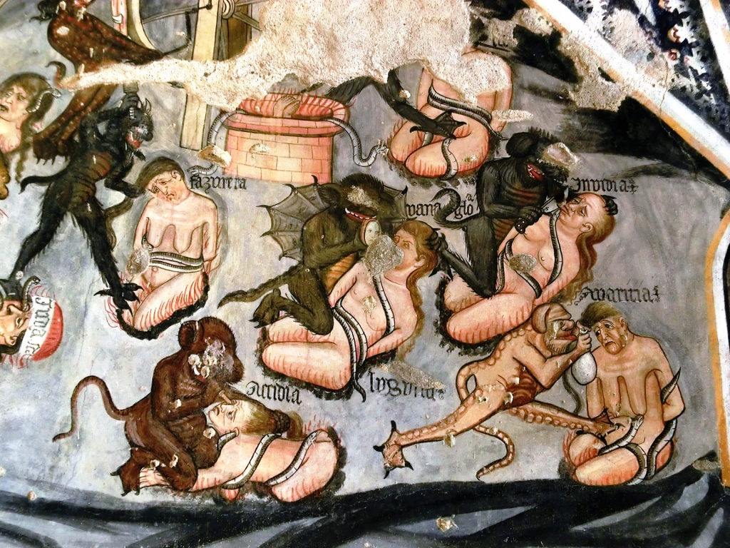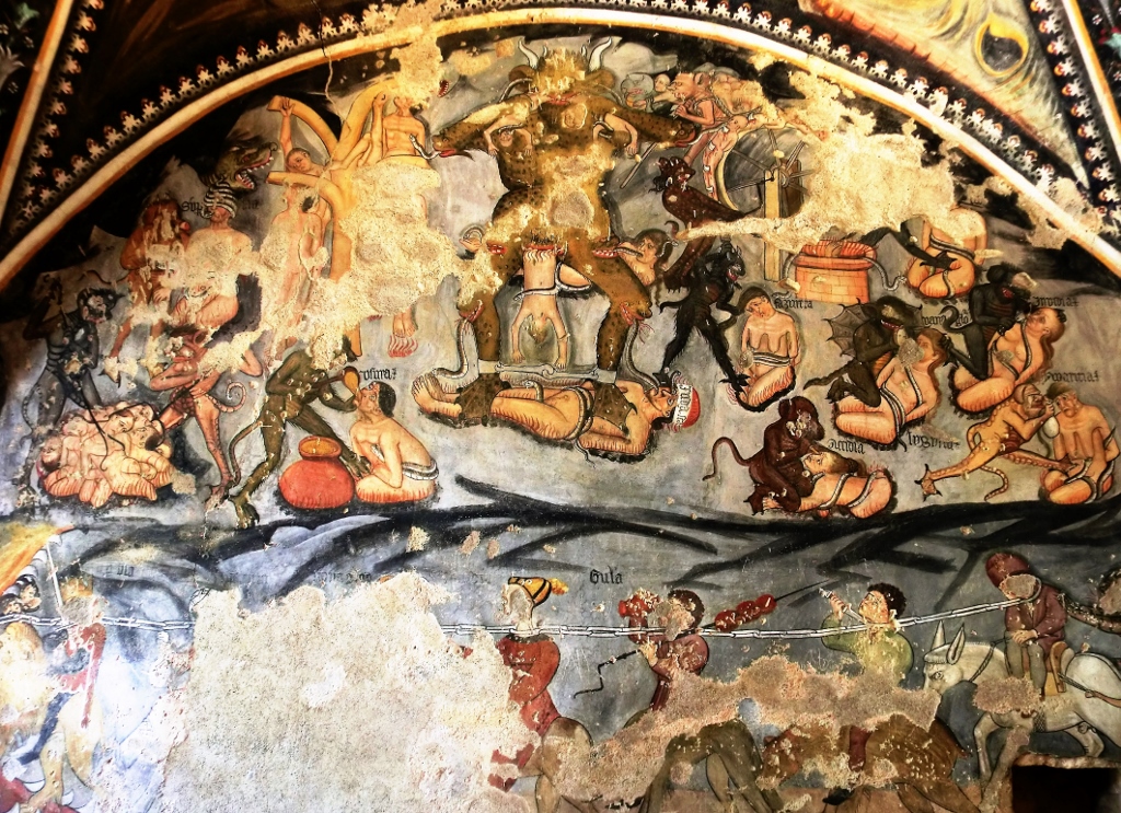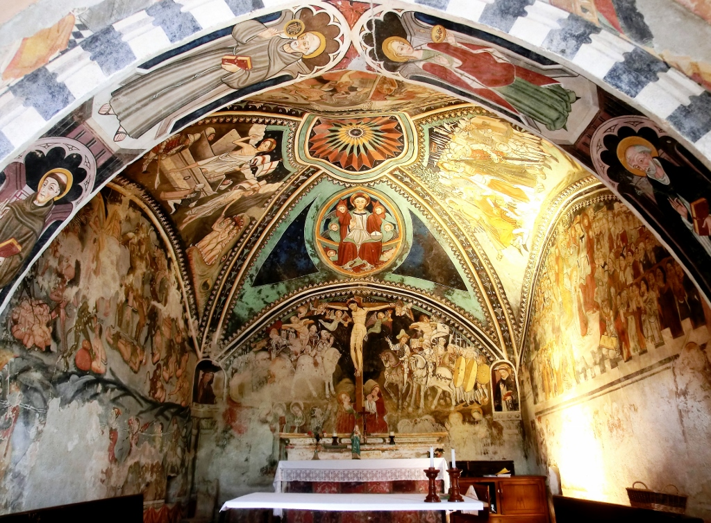 Interno: ciclo di affreschi del primo '400 raffigurante scene della Vita di Gesù, la Città Celeste, l'Inferno, le Opere di Misericordia, la cavalcata dei Vizi e altri. |
