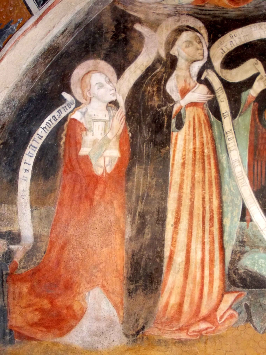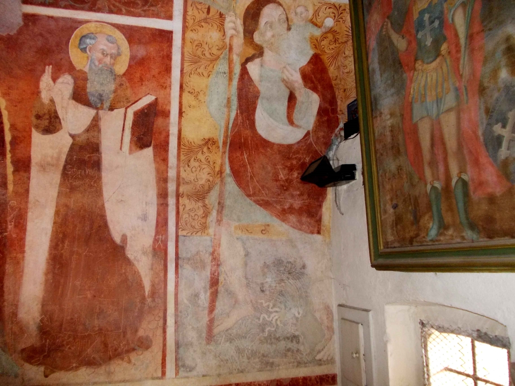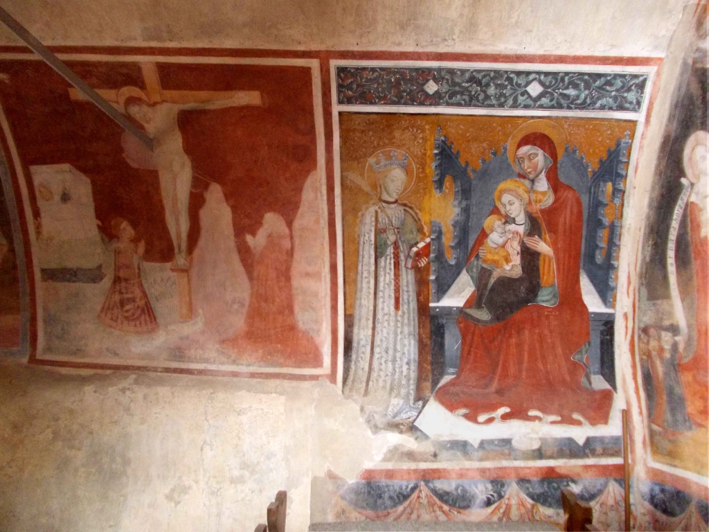 Interno: ciclo di affreschi eseguito intorno al 1473 probabilmente da Antonio da Monte Regale (vissuto introno alla metà dl '400); coprono una superfice di 33 metri quadri e hanno come tema dominante l'esaltazione della Maternità della Vergine. Alla pareti laterali sei figure di Santi, la buona e la cattiva preghiera, la Madonna del Latte; sulla parete d'altare è illustrato un passo di un sermone di San Bernardo di Chiaravalle (1090-1153): "nulla sarà negato da Dio all'uomo se l'intercessione procede da Maria a Cristo e da questo al Padre". |