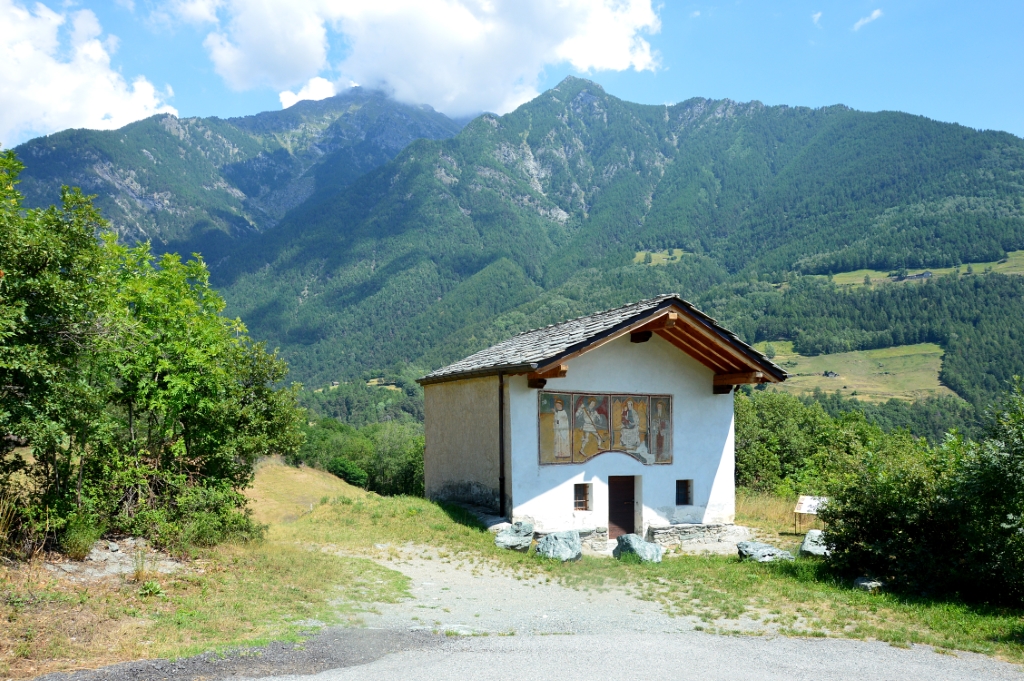 Esterno: sulla facciata pregevoli affreschi del 1441: al centro la figura della Vergine con il Bambino con ai lati san Michele, armato di spada e bilancia, sant’Antonio abate e un santo forse identificabile con san Bernardo d’Aosta. |