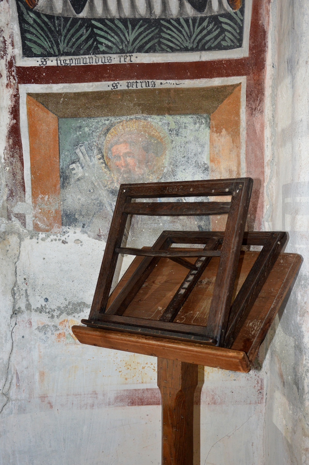 Interno: nell’abside e nell’arco trionfale pregevoli affreschi del 1441: Cristo in mandorla circondato dal tetramorfo, costituito dai simboli dei quattro evangelisti (l’aquila, il bue, l’angelo e il leone). Sulla parete si susseguono invece le figure dei dodici apostoli con i santi Massimo e Sigismondo, probabilmente opera di Giacomino d'Ivrea (attivo tra il 1426 e il 1469). |