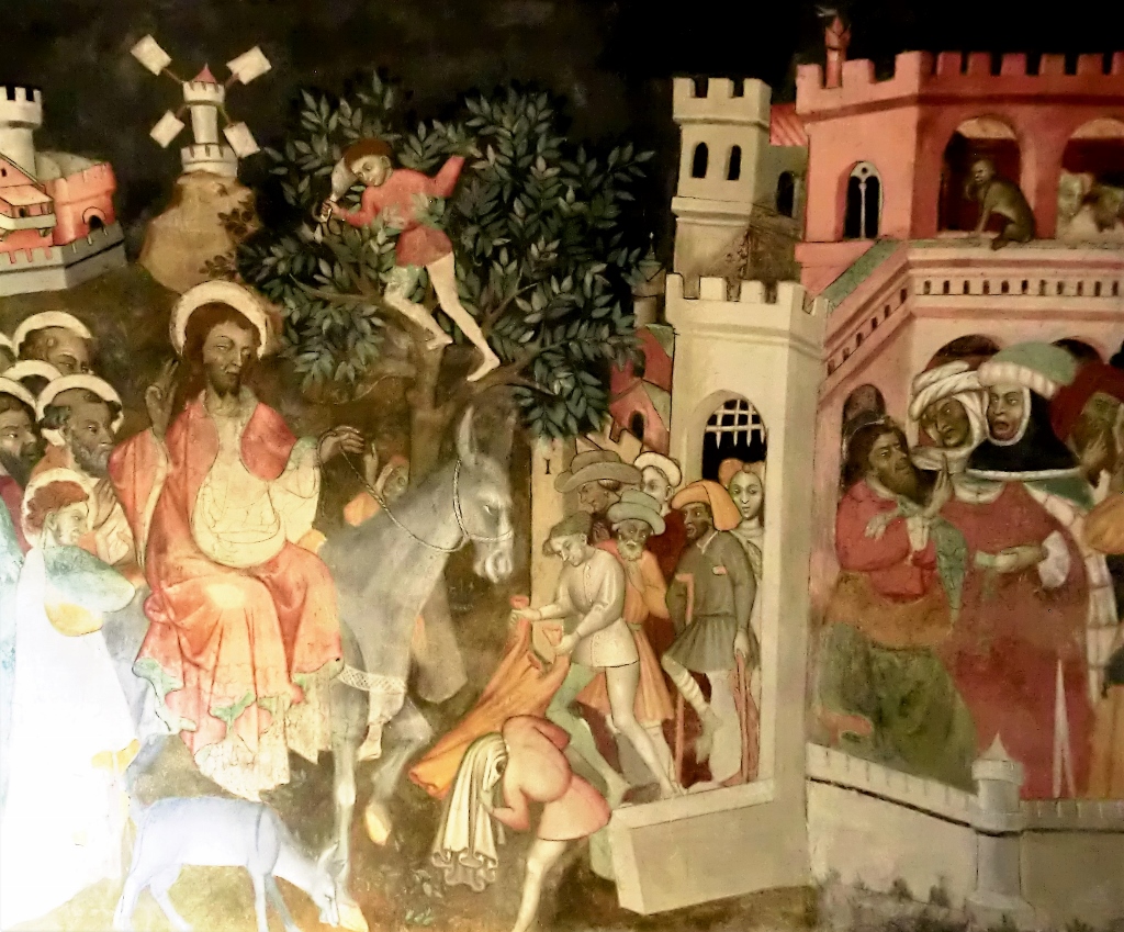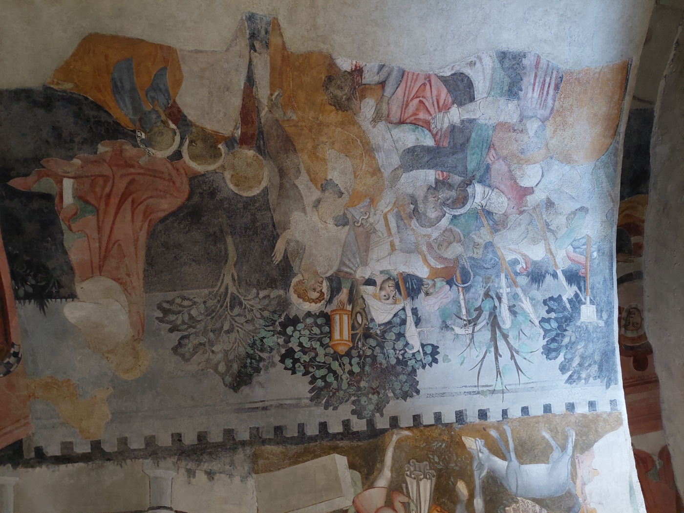 Interno: lacerti dipinti sulle pareti laterali e, nel coro, molto ben conservati, una splendida storia della passione dipinta da un ignoto pittore, diverso dall’autore della Sala baronale, che mostra influssi jaqueriani. Di pianta quadrata e di piccole dimensioni, il coro presenta tre lunette con alla base un velario a motivi geometrici, affollate da personaggi e architetture, dipinti con grande attenzione ai particolari e alle espressioni dei volti. Sulla parete di fondo la Crocifissione, nella parte inferiore tagliata da una lapide funebre del 1553; sulle pareti nord e sud, in due registri, le scene della passione si susseguono da sinistra verso destra con, a nord: l’ingresso in Gerusalemme, il tradimento di Giuda e l’ultima Cena, sul registro inferiore, la lavanda dei piedi, la preghiera nell’orto degli ulivi e la cattura. Invece sulla parete sud, in alto, sono raffigurati Cristo davanti a Caifa, il rinnegamento di Pietro, Cristo deriso e poi davanti a Pilato. Sul registro inferiore l’andata al Calvario, in cui si apre la finestra che dà luce all’ambiente |