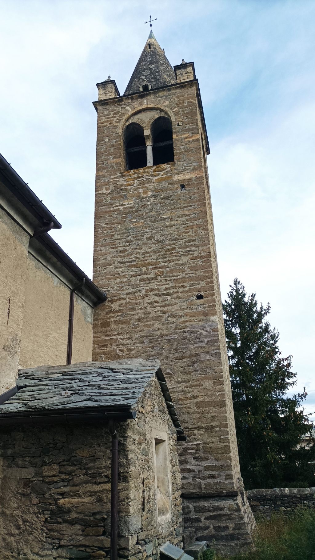 Campanile: del 15° secolo, in pietra con bifore. |