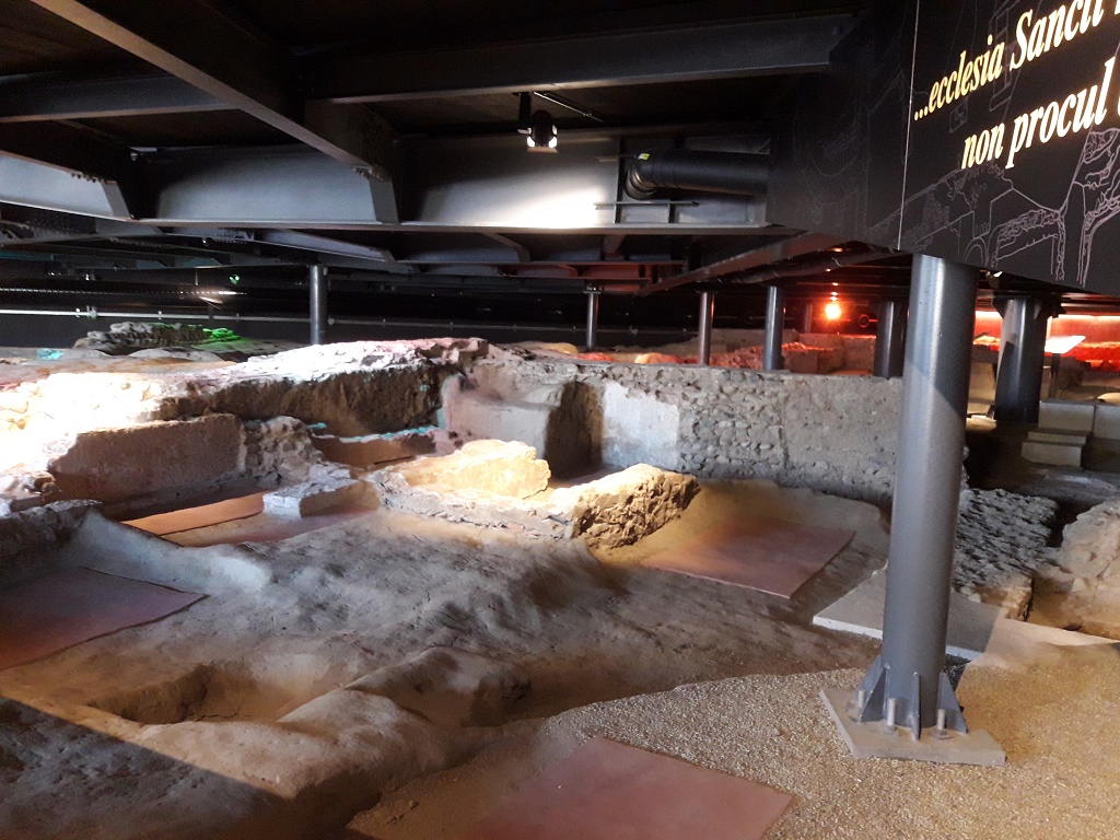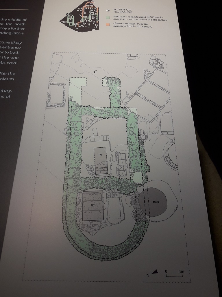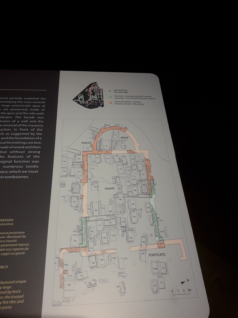 Notizie generali: La chiesa, a navata unica e grande abside a ovest, si innesta sulle strutture dei mausolei sfruttandone le pareti laterali. La caratteristica tecnica muraria a piccoli ciottoli legati da malta rosata consente di distinguere altri resti di questa fase edilizia conservati nella parte orientale dell’area, dove si estendeva una sorta di nartece o porticato di ingresso. I resti murari e le fosse di spoliazione delle tombe testimoniano un’occupazione pianificata di tutto lo spazio interno all’edificio e di buona parte dell’area perimetrale esterna e intaccano le pareti dei mausolei precedenti, demoliti nelle parti non inglobate nelle pareti della chiesa. La sorte del mausoleo absidato rimane invece separata, anche se tutto fa pensare che continui a essere utilizzato durante la vita della chiesa. La totale assenza di materiali ceramici, osteologici ed epigrafici rende problematica la datazione del complesso, ma l’orientamento a ovest delle absidi e le caratteristiche architettoniche, sia dei mausolei sia della chiesa, depongono a favore di una cronologia antica, compresa tra il IV secolo e gli inizi del V. (Fonte www.museotorino.it) |