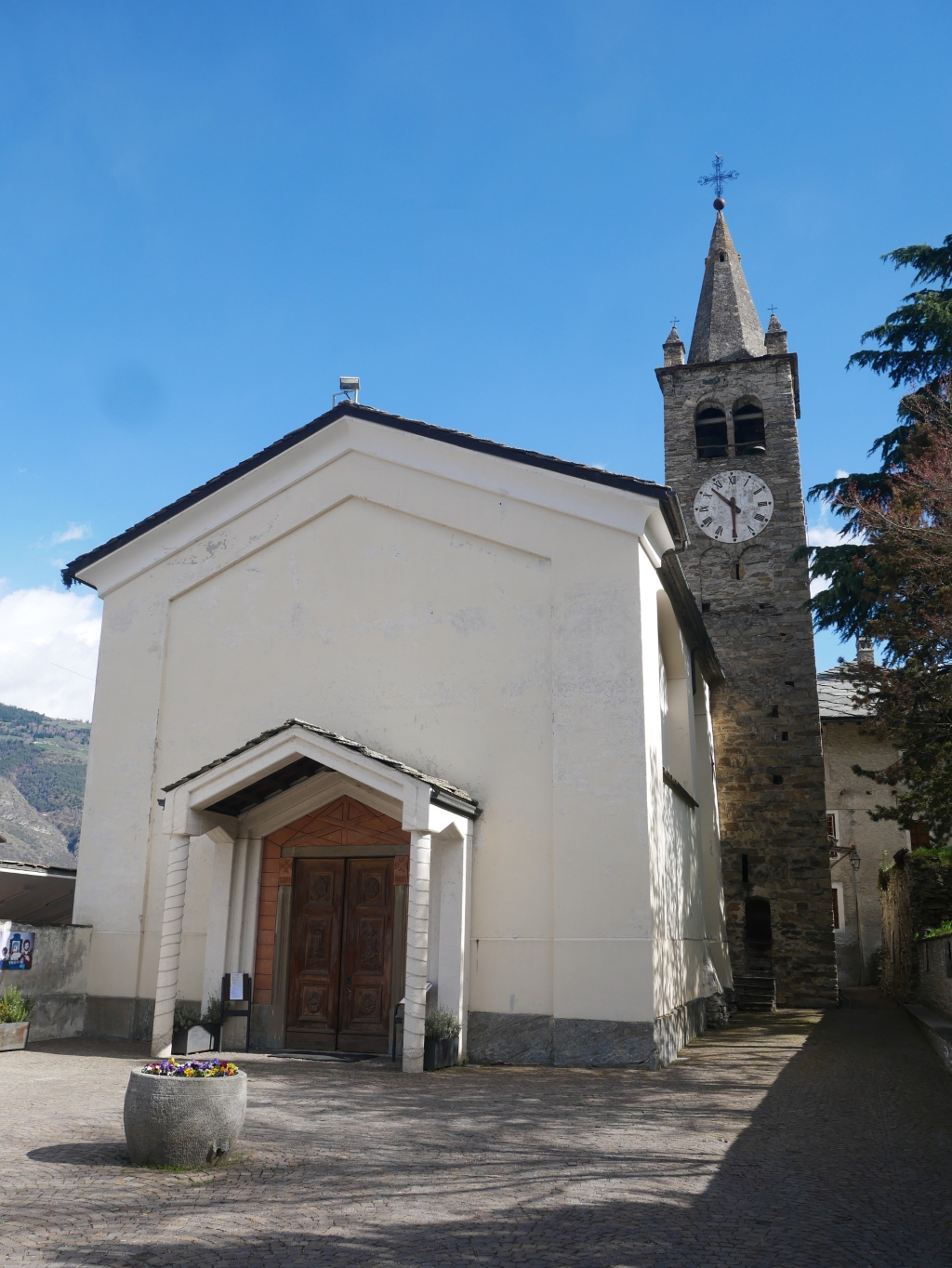 Esterno: della parrocchiale quattrocentesca conserva, sulla parete accanto al campanile, una porta tamponata sovrastata da un architrave monolitico lavorato |