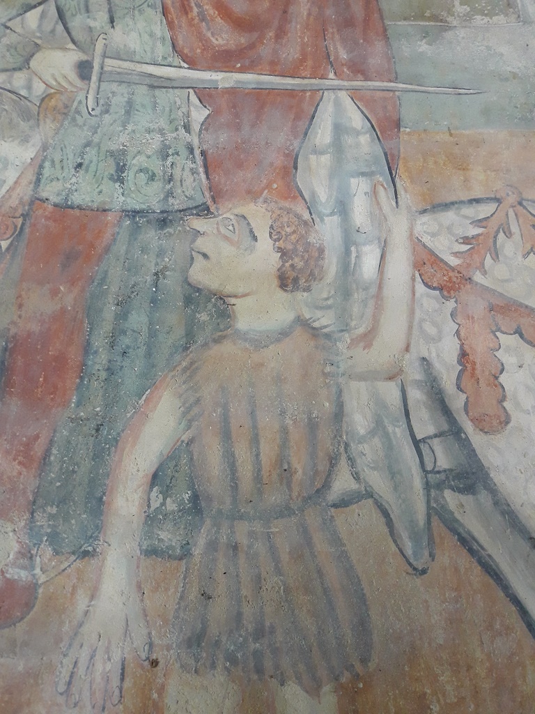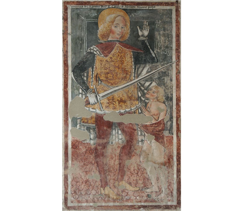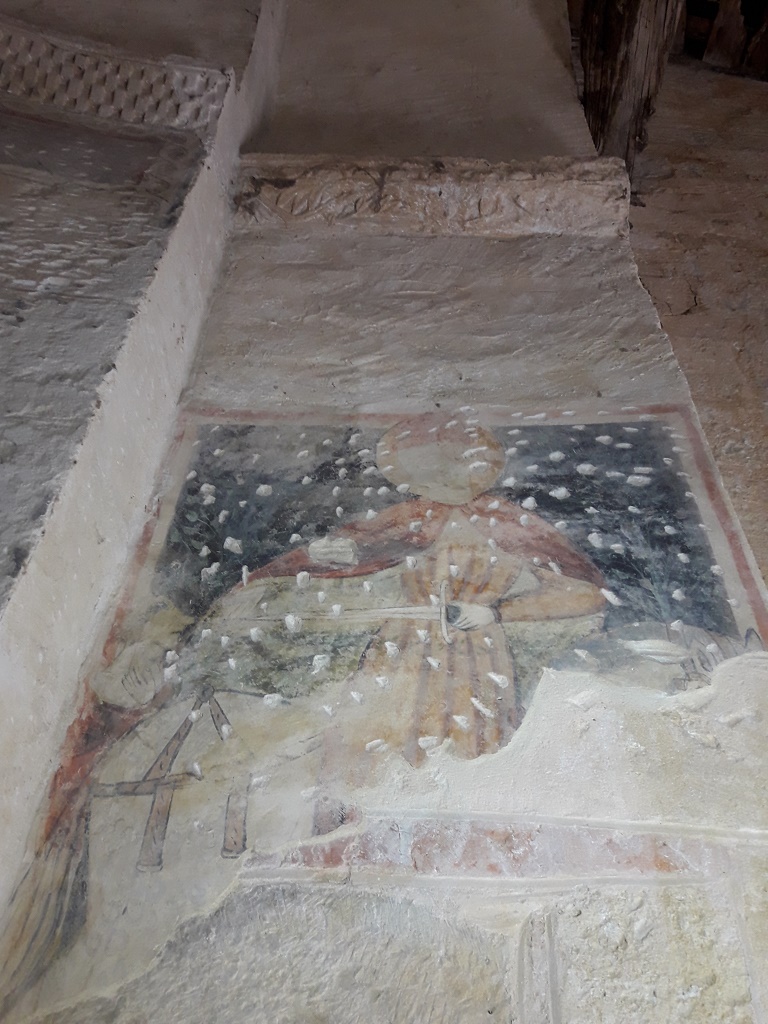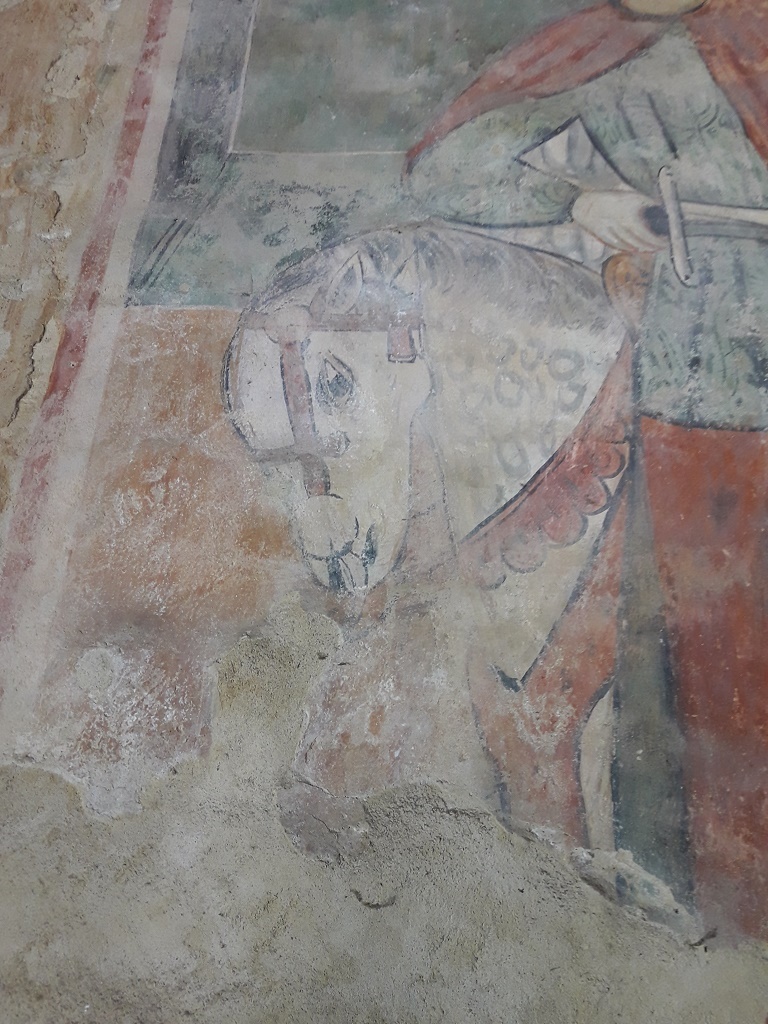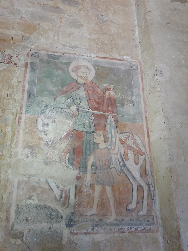 Interno: A capriate a vista senza volte. Sulla parete adiacente l'arco trionfale affresco di San Martino che dona il Mantello databile XVI secolo e commissionato da Johannes Merlinus o Miglino, come si legge nella scritta latina presente. L'affresco, di fattura molto ingenua e popolare, rappresenta un San Martino, ieratico e solenne su un cavallo riccamente bardato, nell'atto di tagliare il mantello. Il povero è rappresentato scarsamente vestito con grandi occhi e naso puntati verso il santo. Bello il muso del cavallo anch'esso dai grandi occhi. Sulla parete desta altro San Martino che taglia il mantello di fattura più "professionale", purtroppo fortemente rovinato. |
