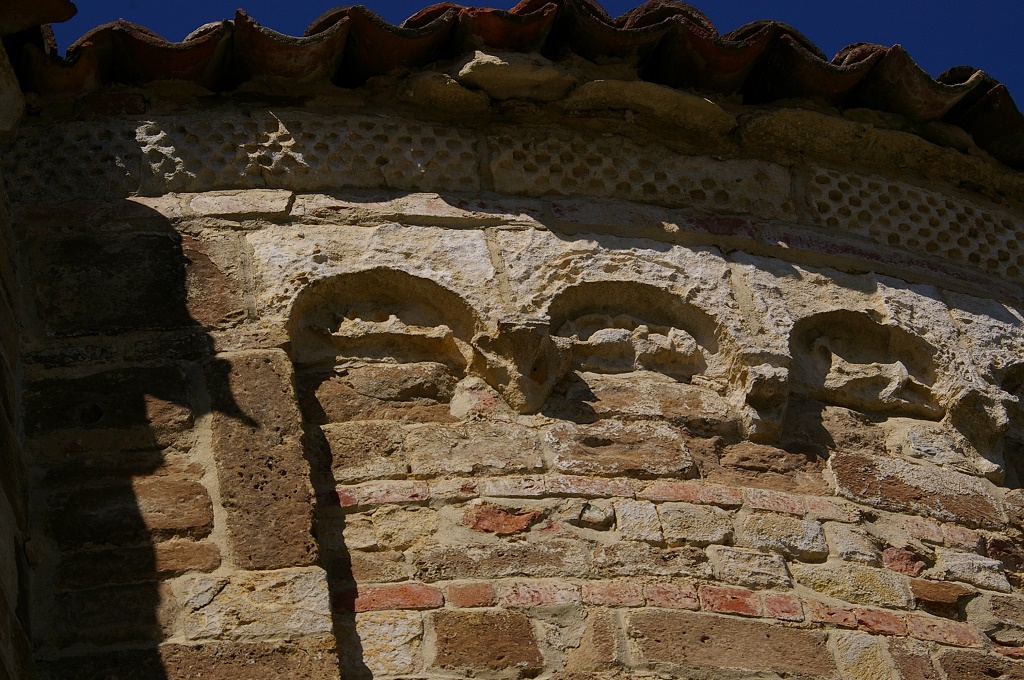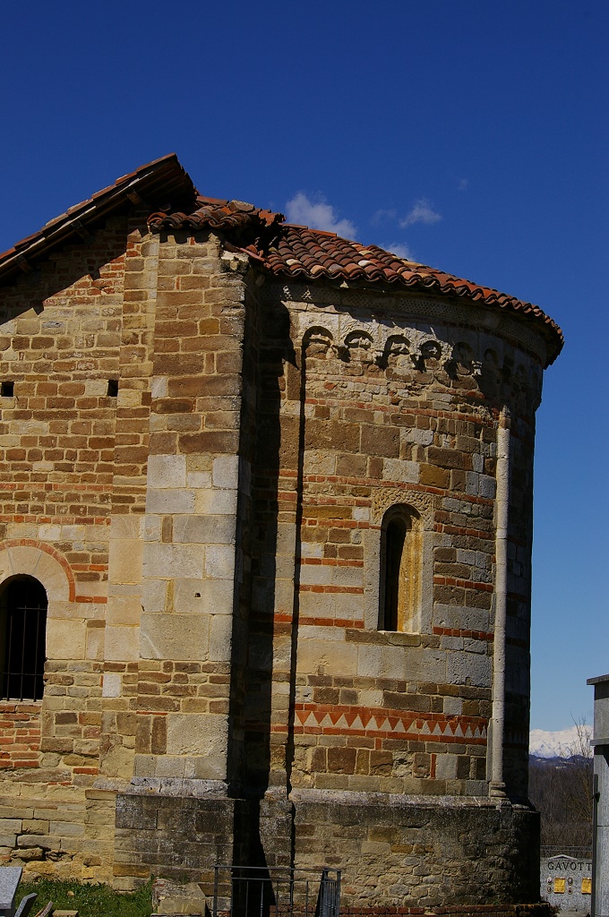 Esterno: la facciata è suddivisa in cinque campi da lesene. Abside romanica con cornice ad archetti pensili scolpiti con motivi a nastro; ogni campo è occupato da figure scolpite a rilievo raffiguranti quadrupedi, uccelli e altre figure. Vi troviamo tutti gli elementi tipici del romanico astigiano: partitura con semicolonne, alternanza mattone e arenaria, fregi a dente di sega, cornicione a scacchiera o damier, anche se solamente inciso e non a tasselli alternati come nei migliori esempi, archetti pensili con figure di animali appesi, monofore dalla ghiera decorata con fregi. |