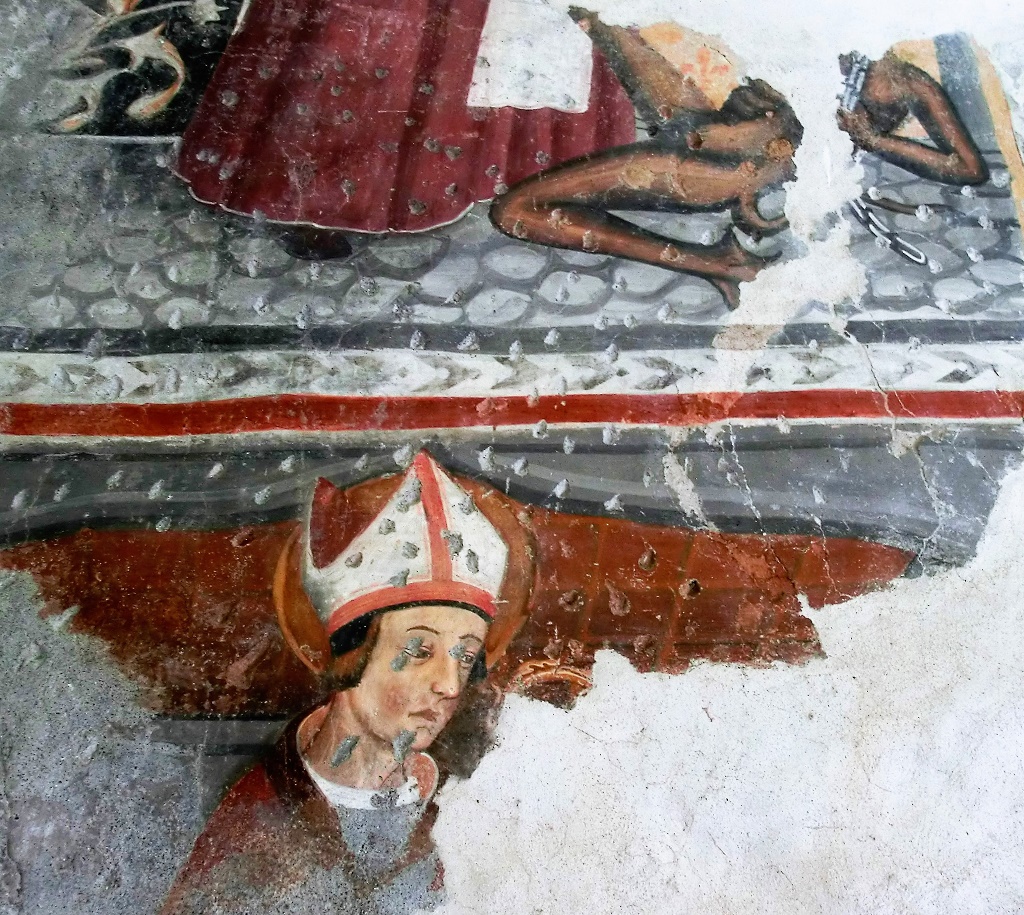 Interno: lacerti di pittura ad affresco rinvenuti durante gli ultimi restauri: si tratta delle raffigurazioni di San Michele arcangelo, della Morte e di scene frammentarie delle storie di San Bernardo da Mentone, realizzate nei primi decenni del Cinquecento e assegnati al cosiddetto Maestro di Savoulx |