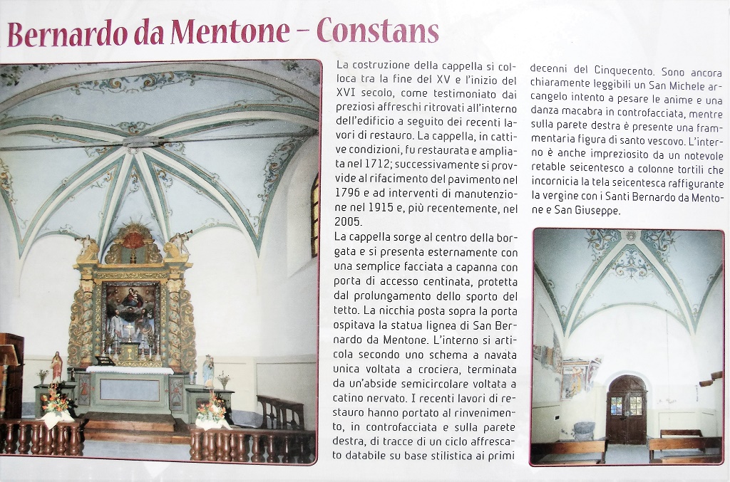 La Cappella si trova a Constans, Oulx (TO), nota come San Bernardo di Mentone. Periodo prevalente: XV secolo. Livello di interesse: 1 (Interessante). Elementi presenti: pittura. Da vedere: interno.