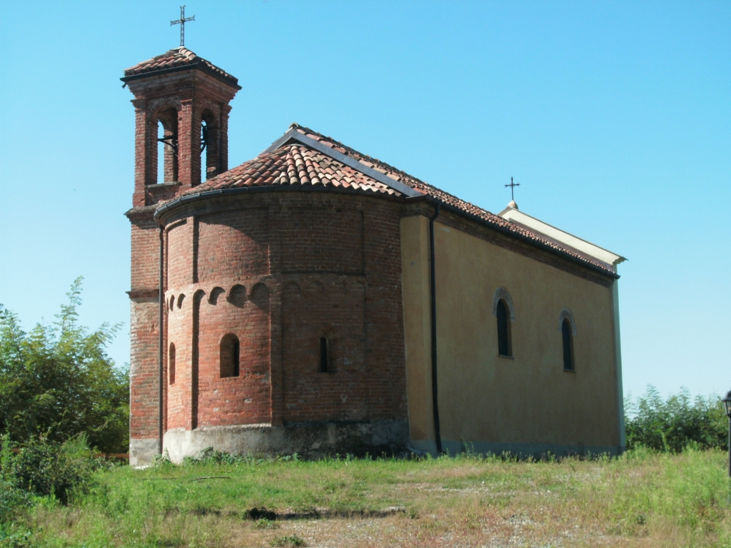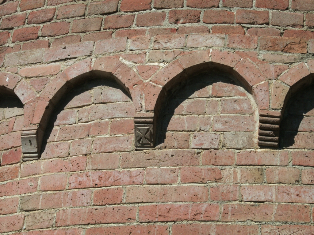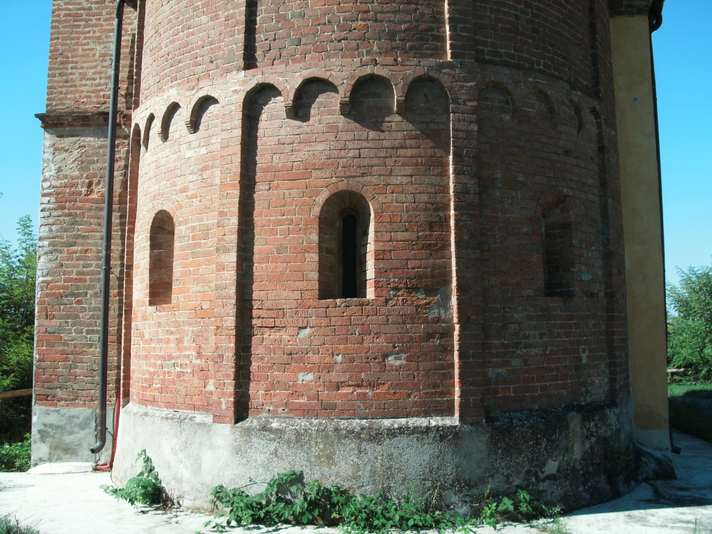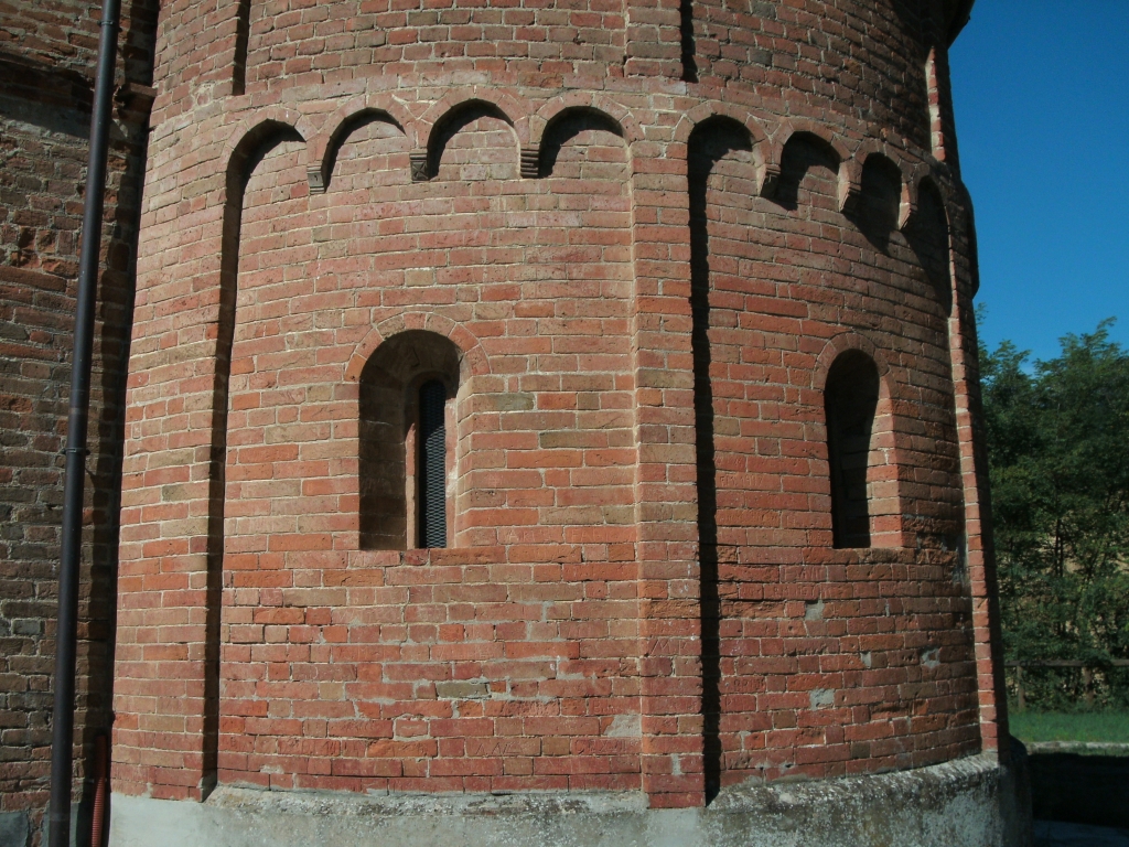 Esterno: abside in cotto con coronamento ad archetti pensili su peducci sagomati. |