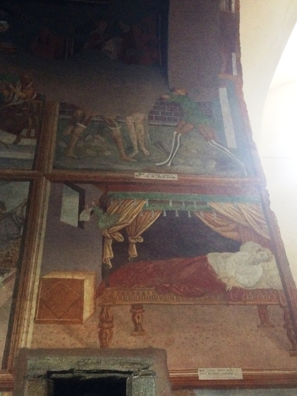 Esterno: ciclo di affreschi del XV secolo con scene della Passione di Cristo, presentazione di Gesù alla folla, Gesù nell'orto degli ulivi e Deposizione con la Vergine, San Giovanni e la Maddalena. Abside sinistra romanica, abside centrale gotica. |