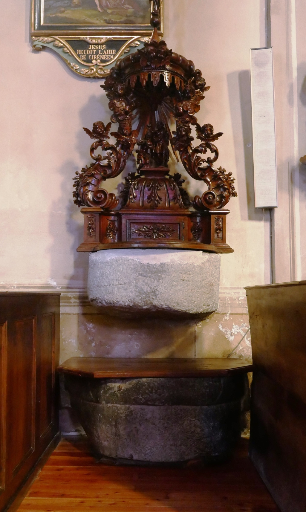 Interno: vasca battesimale in pietra del '400 e reliquiario dello stesso periodo. |