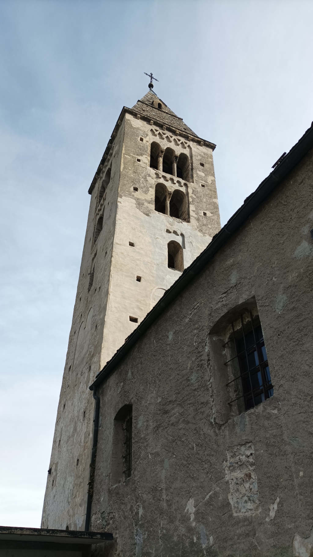 Campanile: romanico a monofore, bifore e trifore con fregi e archetti pensili in pietra. Originario del 10° secolo, sopraelevato nel 12°. |