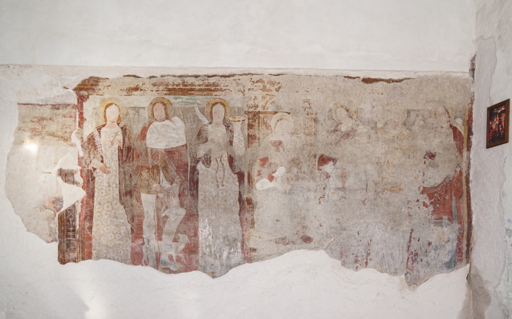 Interno: affreschi di Santi tra cui due Santa Lucia; una porta gli occhi infilzati, l’altra li esibisce su un piattino. Due Madonne col Bambino e vari affreschi di Santi. |