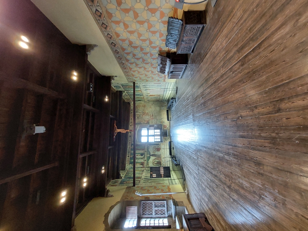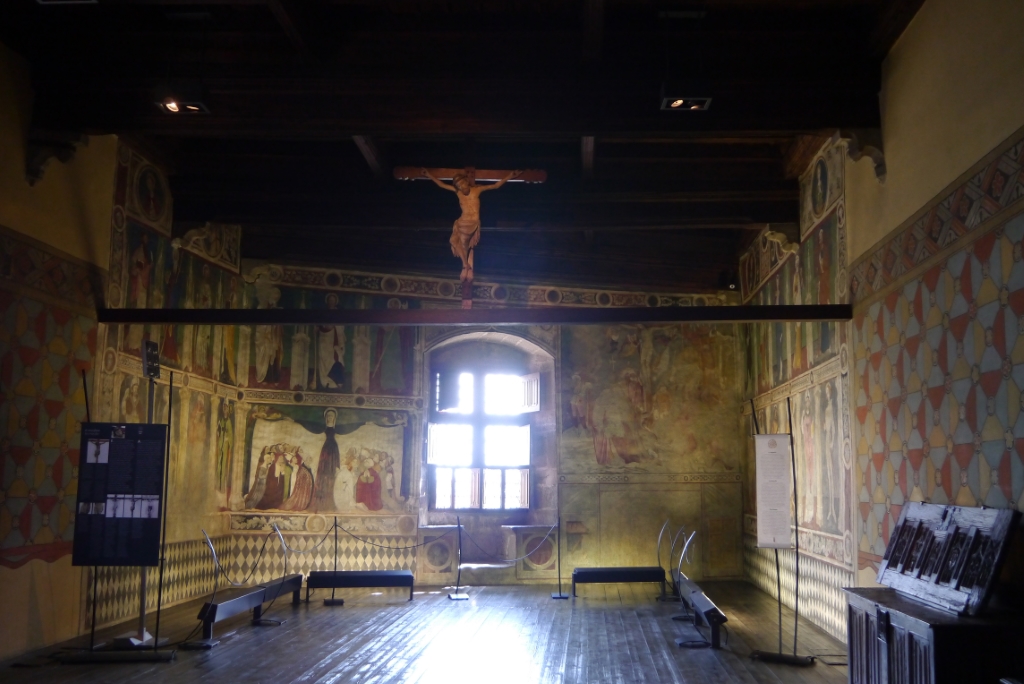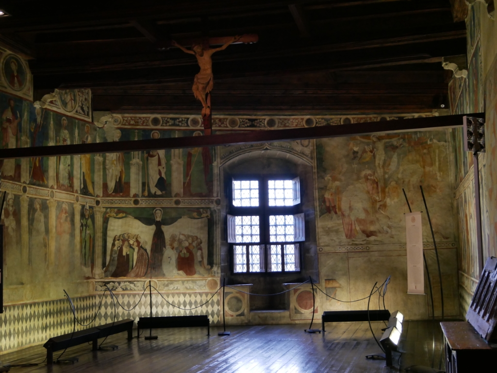 Notizie generali: Dal cortile si accede al piano terra e poi al primo piano del castello, il cui lato nord è occupato da una lunga sala rettangolare definita cappella. |
