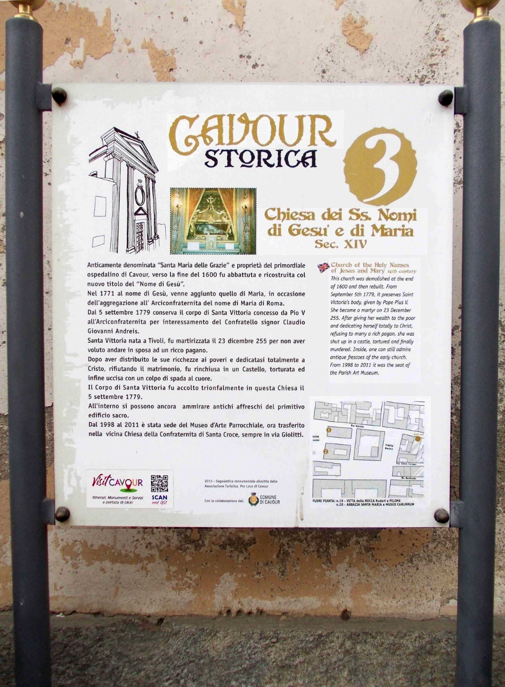 La Chiesa si trova a Cavour (TO), nota come Santi Nomi di Gesù e Maria. Periodo prevalente: XV secolo. Livello di interesse: 1 (Interessante). Elementi presenti: pittura. Da vedere: interno.