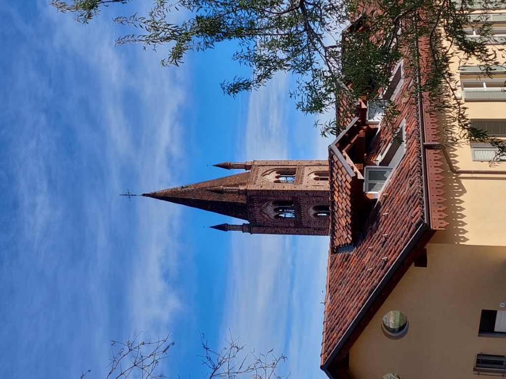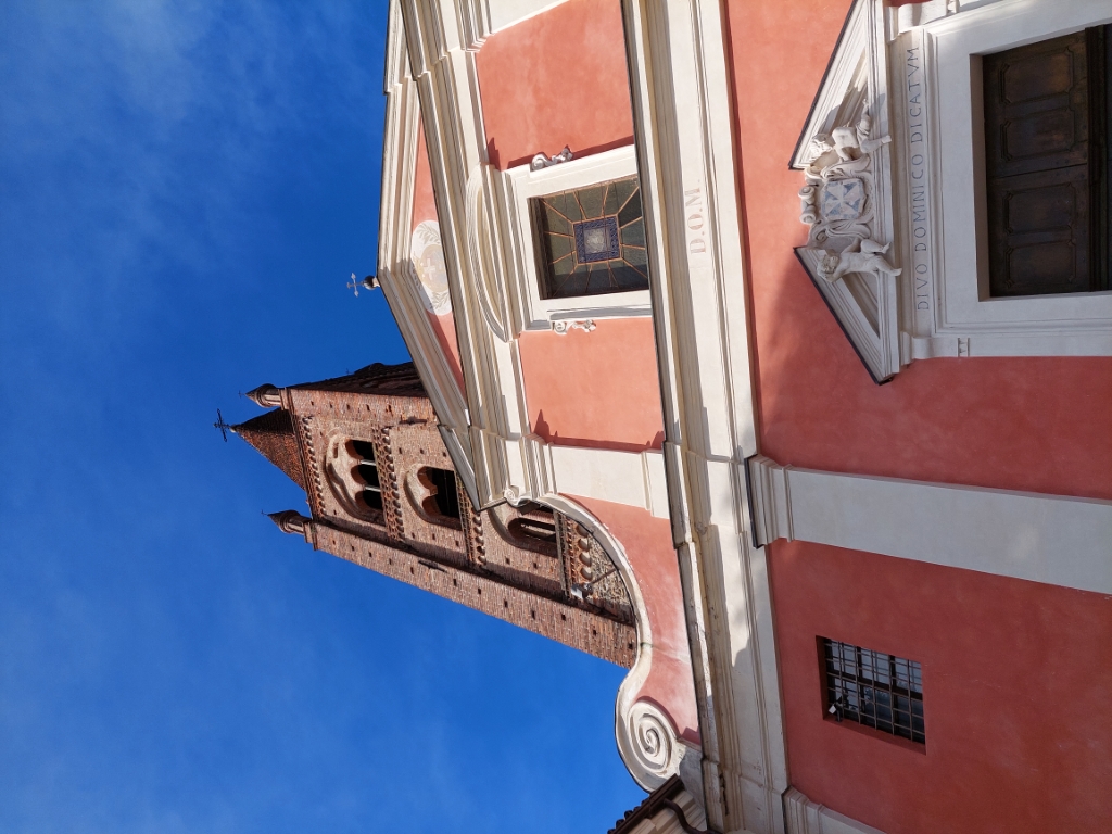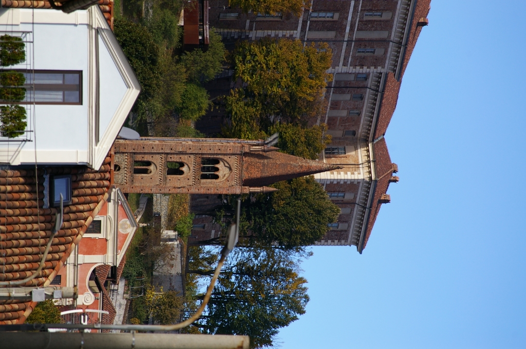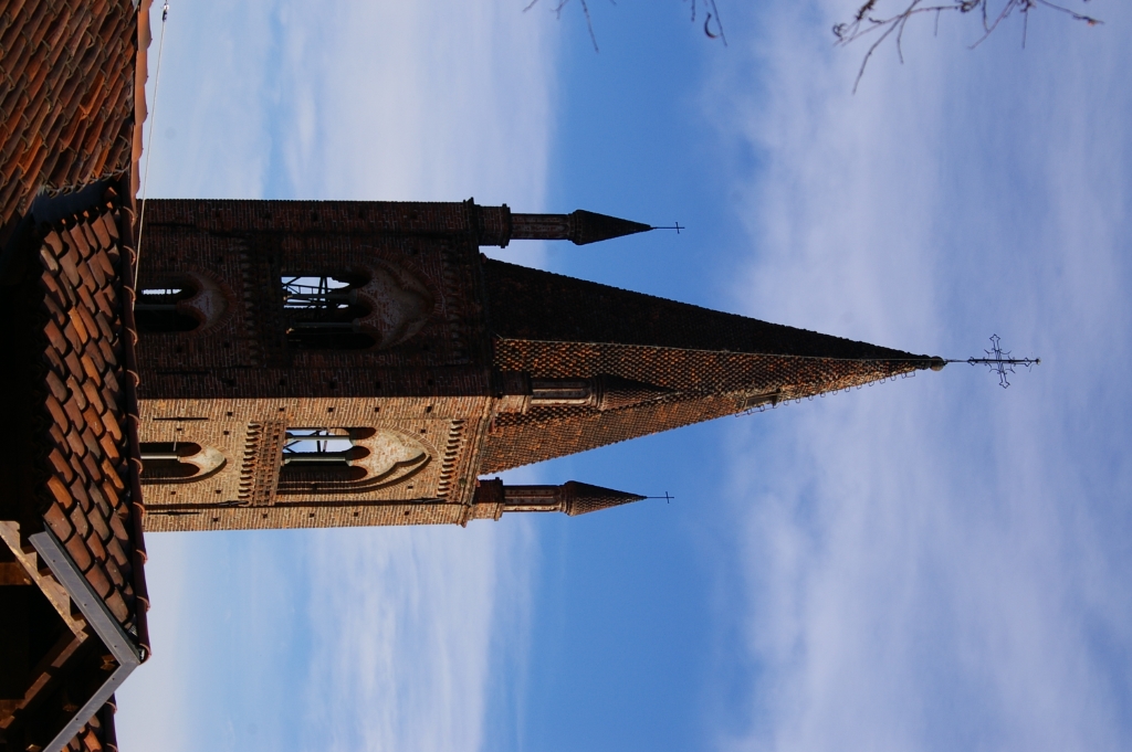 Campanile: in stile lombardo ogivale, unico resto della chiesa primitiva, a bifore e trifore con cuspide piramidale ottagonale contornata da quattro pinnacoli tondi angolari. |