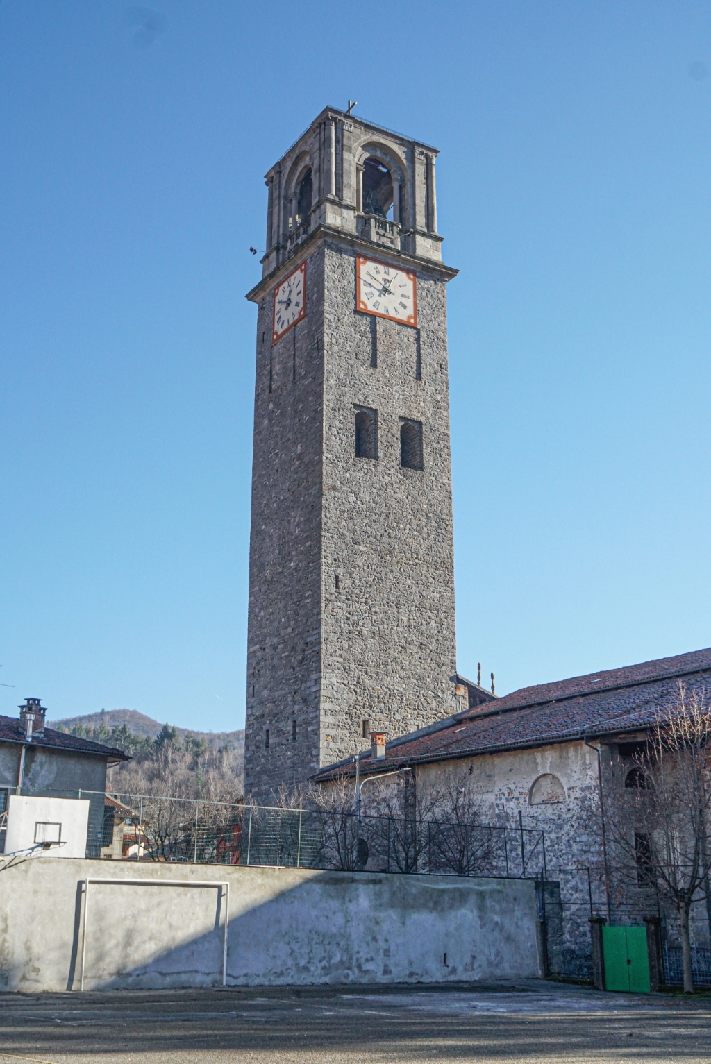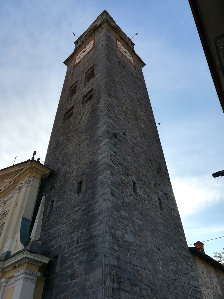 Campanile: molto massiccio, in pietra, privo della cuspide originaria, presenta la curiosità di un doppio muro al cui interno corre la scala che conduce alla cella campanaria. |