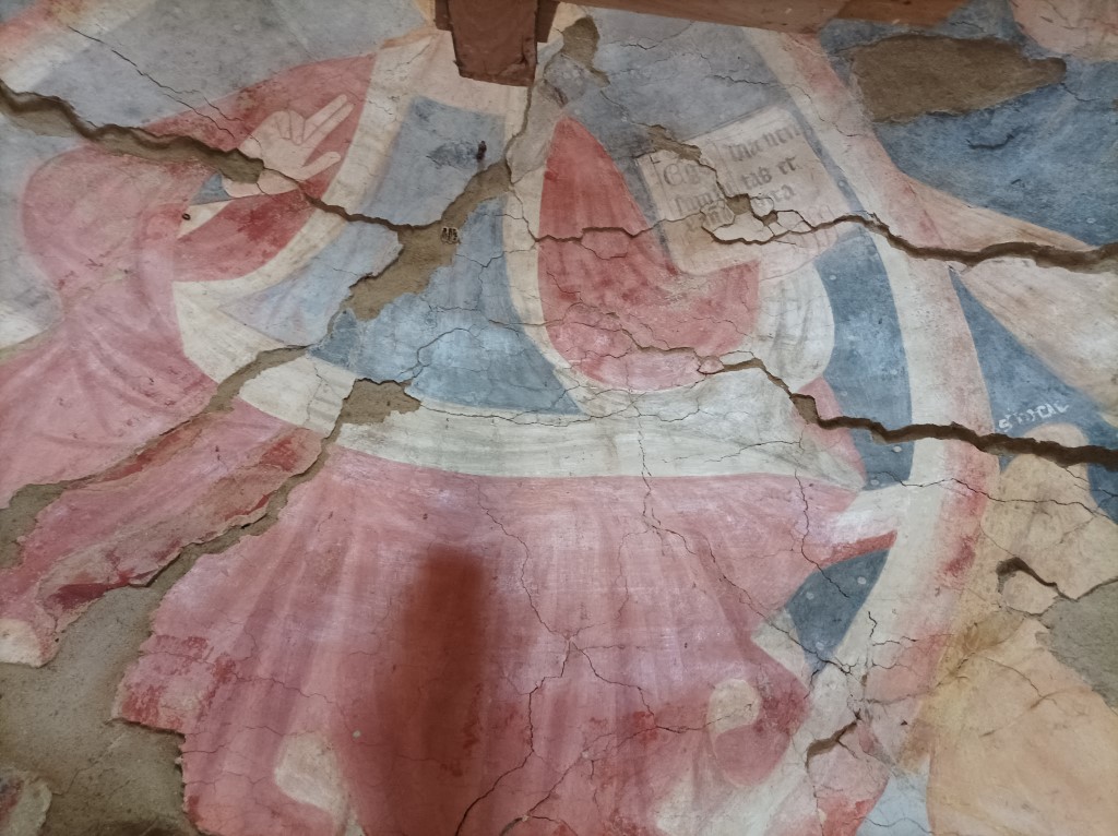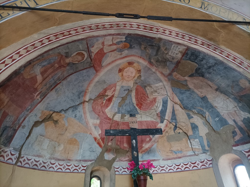 Interno: affreschi del '400 nell'abside con il Cristo in Mandorla con le figure degli Evangelisti e dei due Santi titolari. |